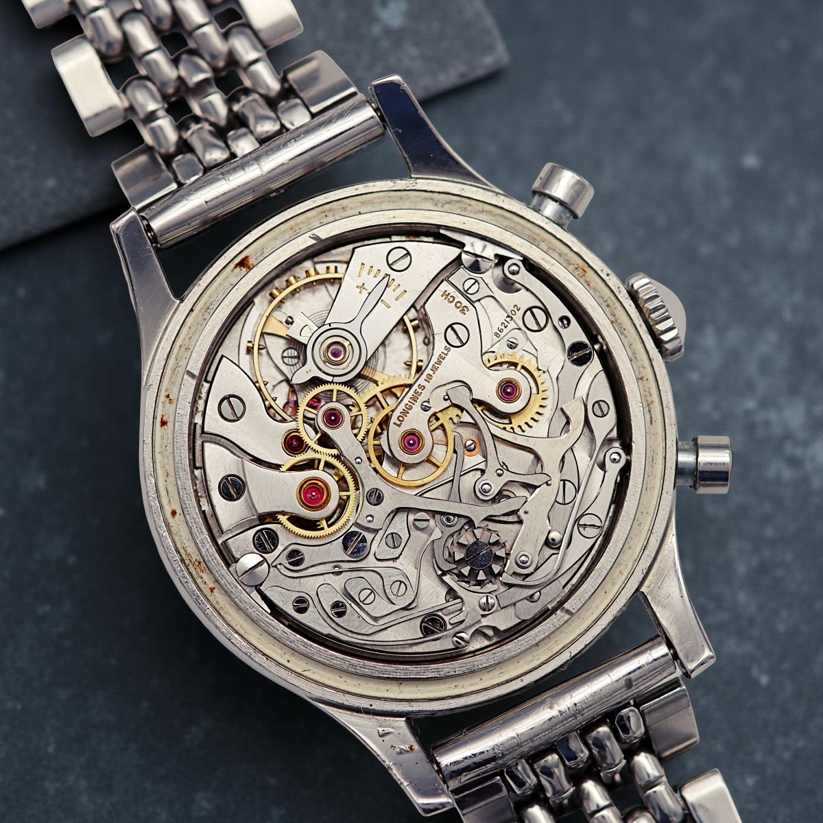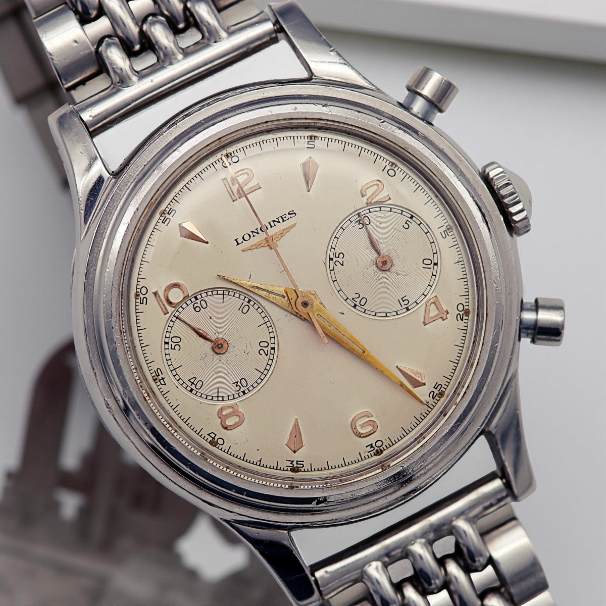 Steel wrist chronograph with pump chronograph buttons,