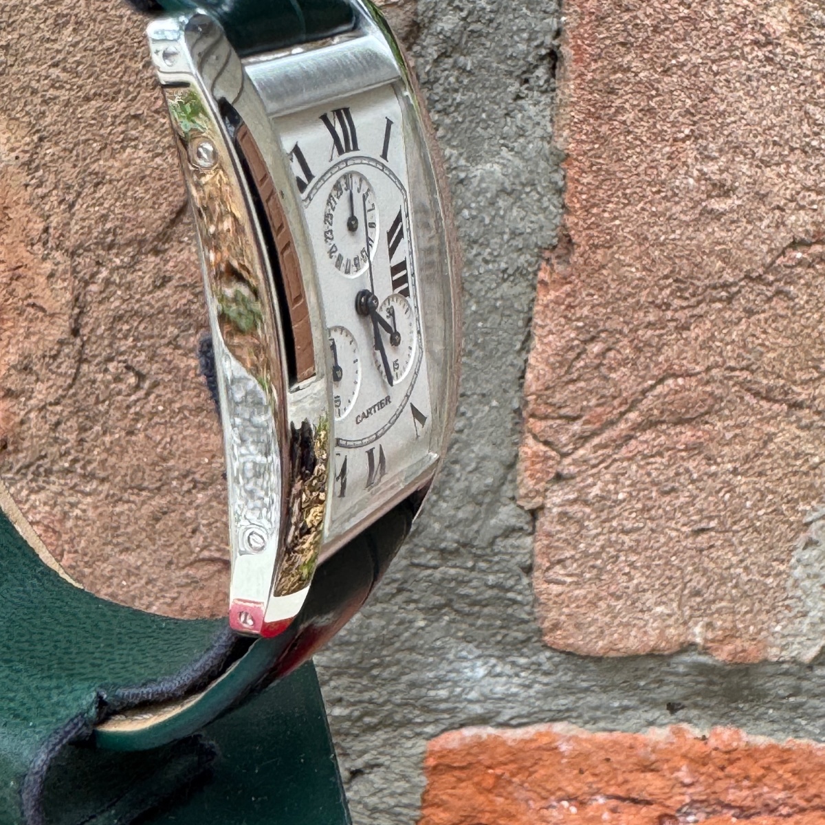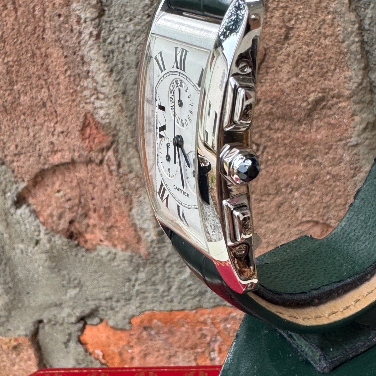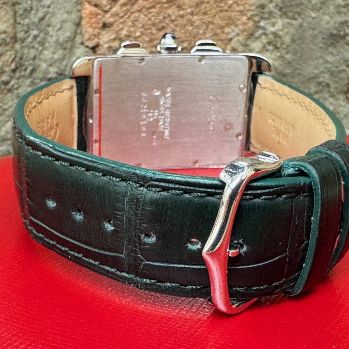 orologio Fuori Produzione con questa referenza, cassa e fibbietta in oro bianco 18k con cinturino in alligatore verde smeraldo opaco, ottime condizioni generali corredato di scatola e ns garanzia di reseller (no garanzia Cartier smarrita negli anni) |