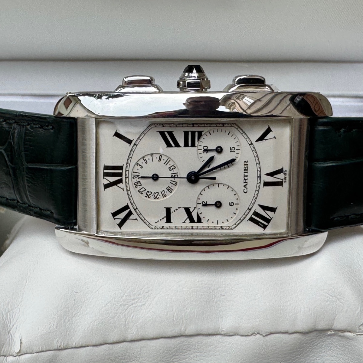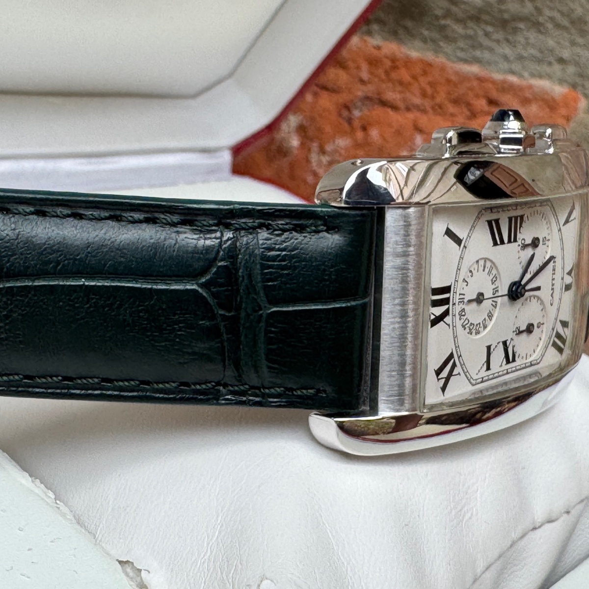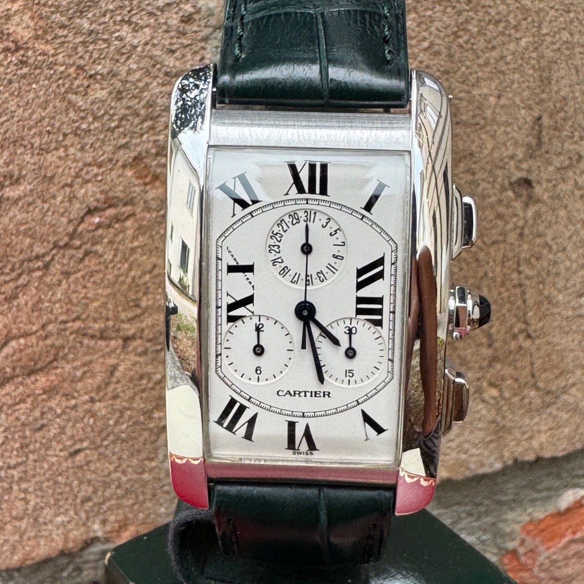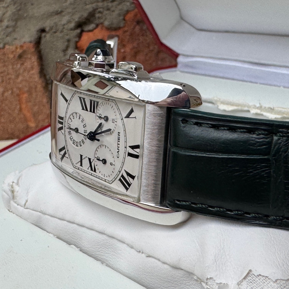 orologio Fuori Produzione con questa referenza, cassa e fibbietta in oro bianco 18k con cinturino in alligatore verde smeraldo opaco, ottime condizioni generali corredato di scatola e ns garanzia di reseller (no garanzia Cartier smarrita negli anni) |