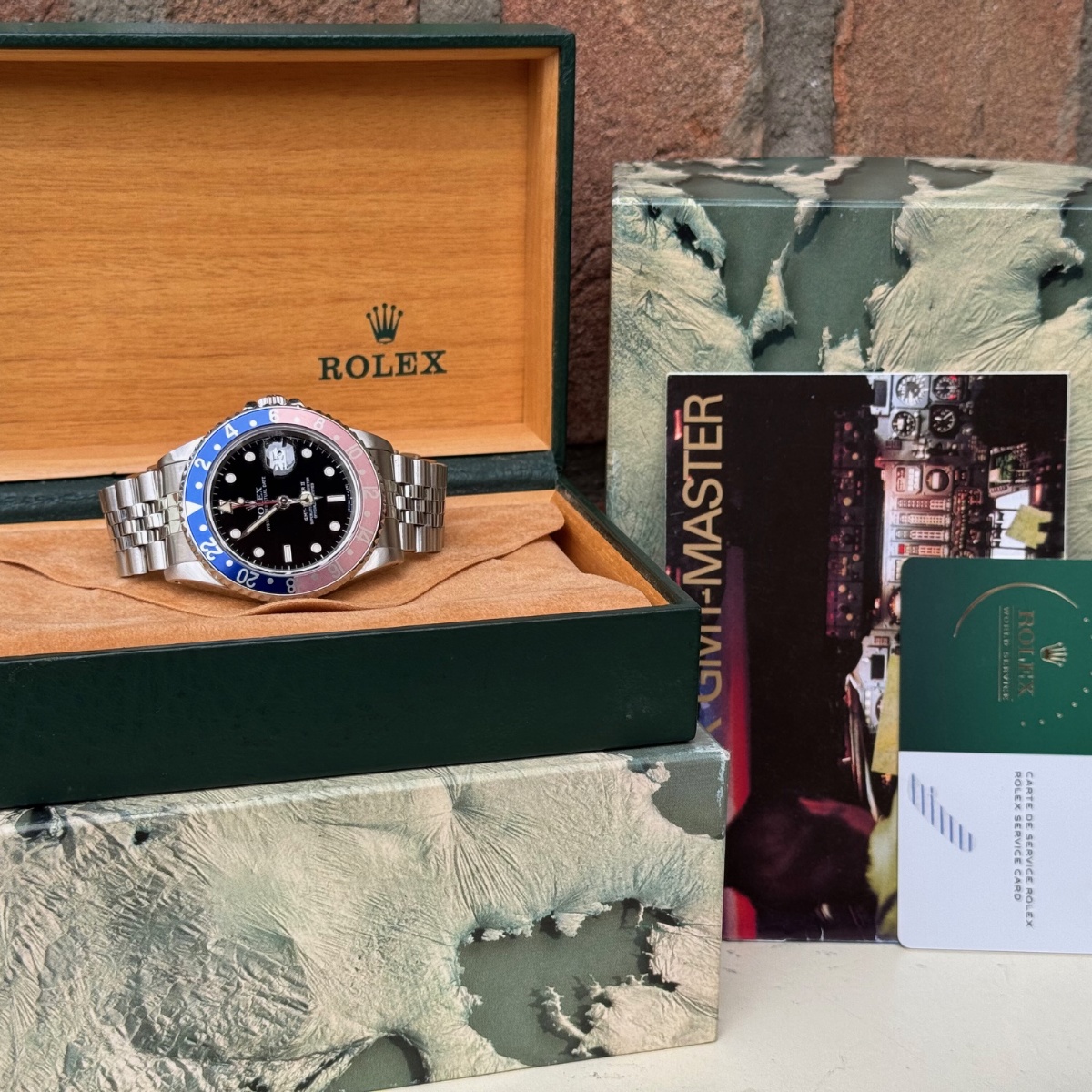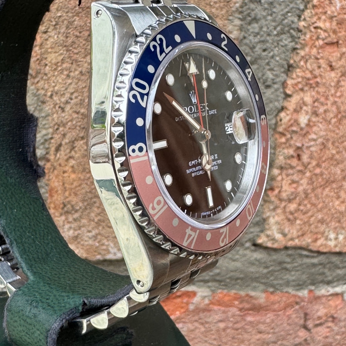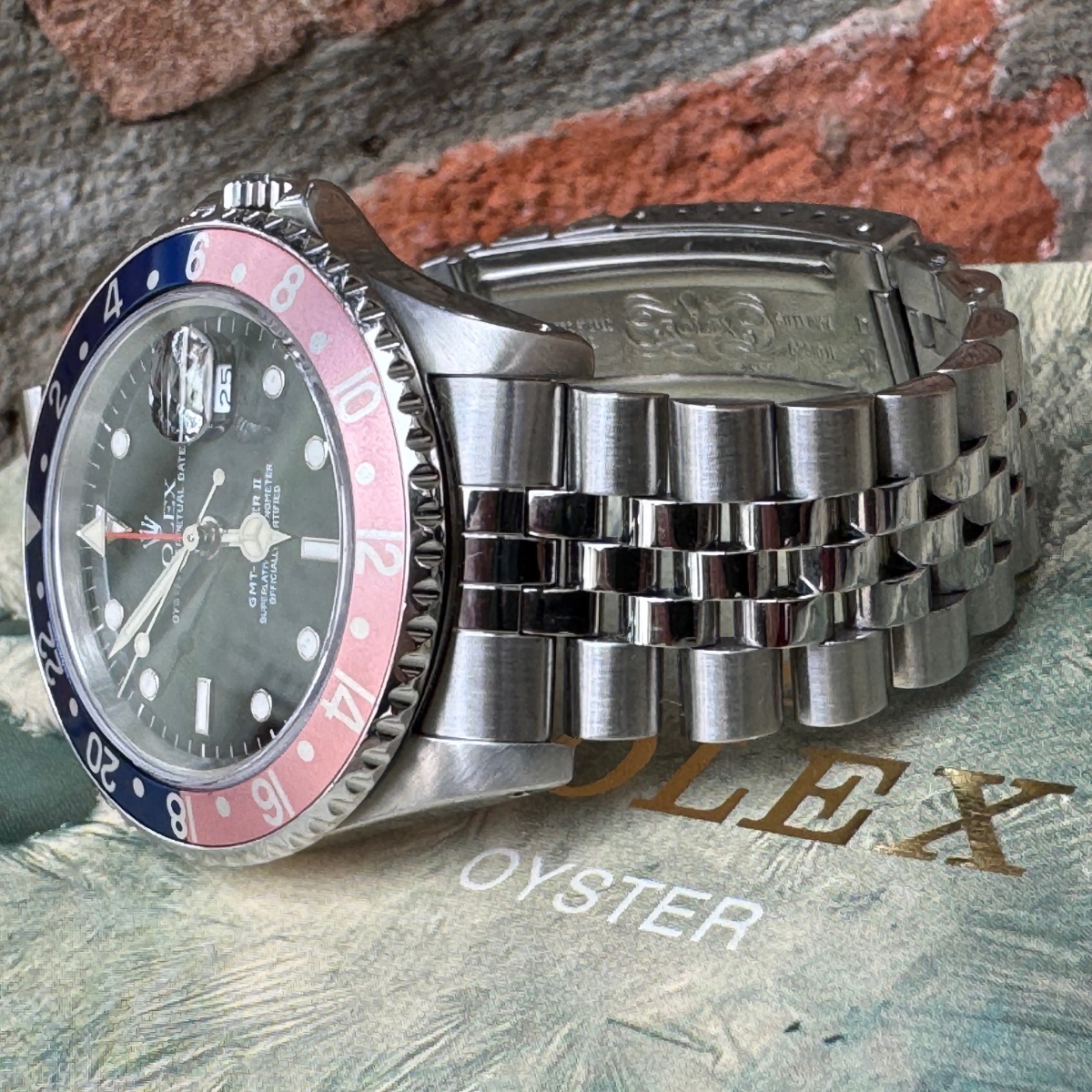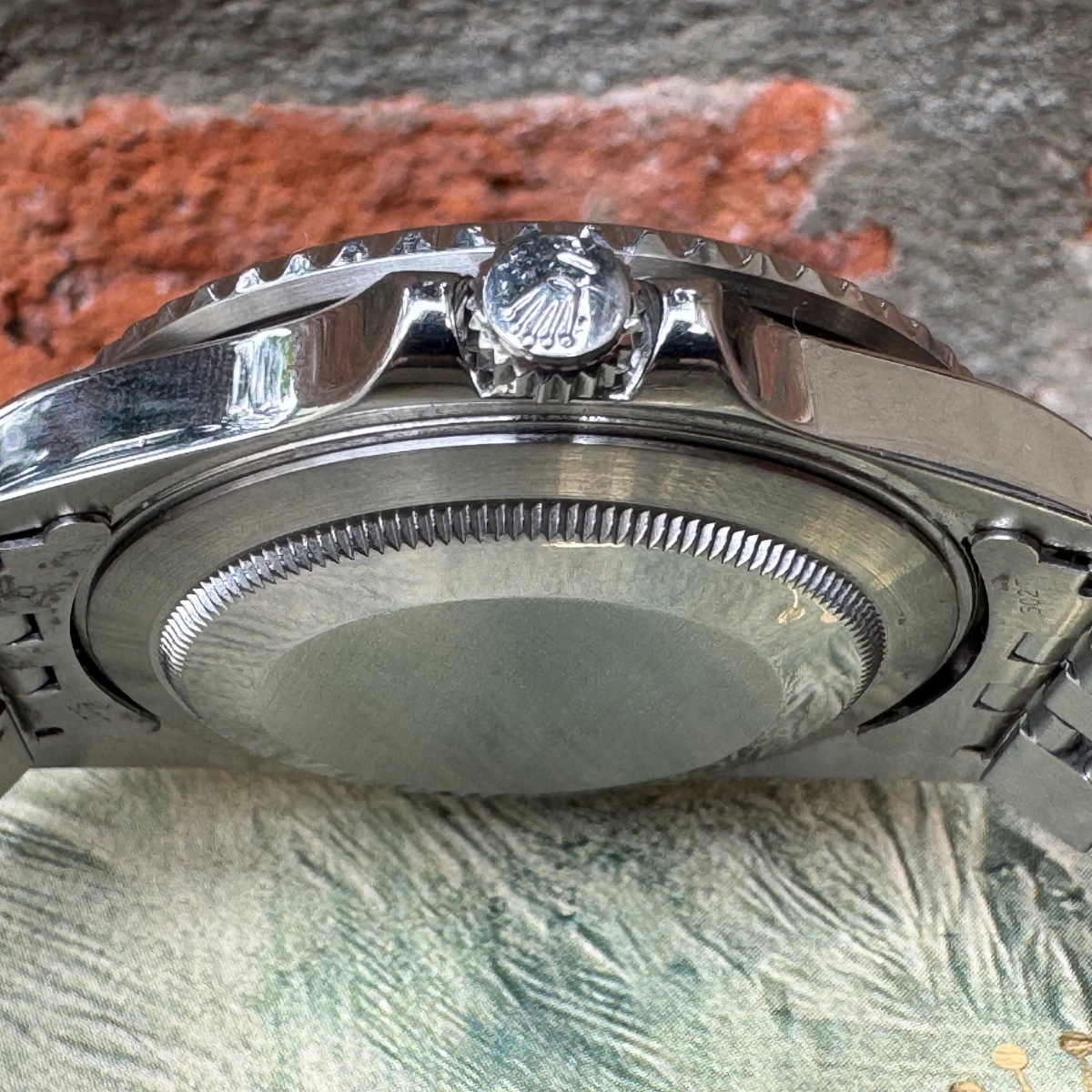orologio da considerarsi ormai "vintage" in condizioni reali ottime, con spettacolare lunetta 'faded' (scolorita in maniera naturale ed uniforme) originale e coeva e bracciale jubilè originale del modello con ultima maglia marchiata 50 e finali 502t. Completo di scatola originale e Service Card Rolex ancora con 1 anno di garanzia ufficiale sul servizio di manutenzione di recente eseguito e documentato (no garanzia originale Rolex) |