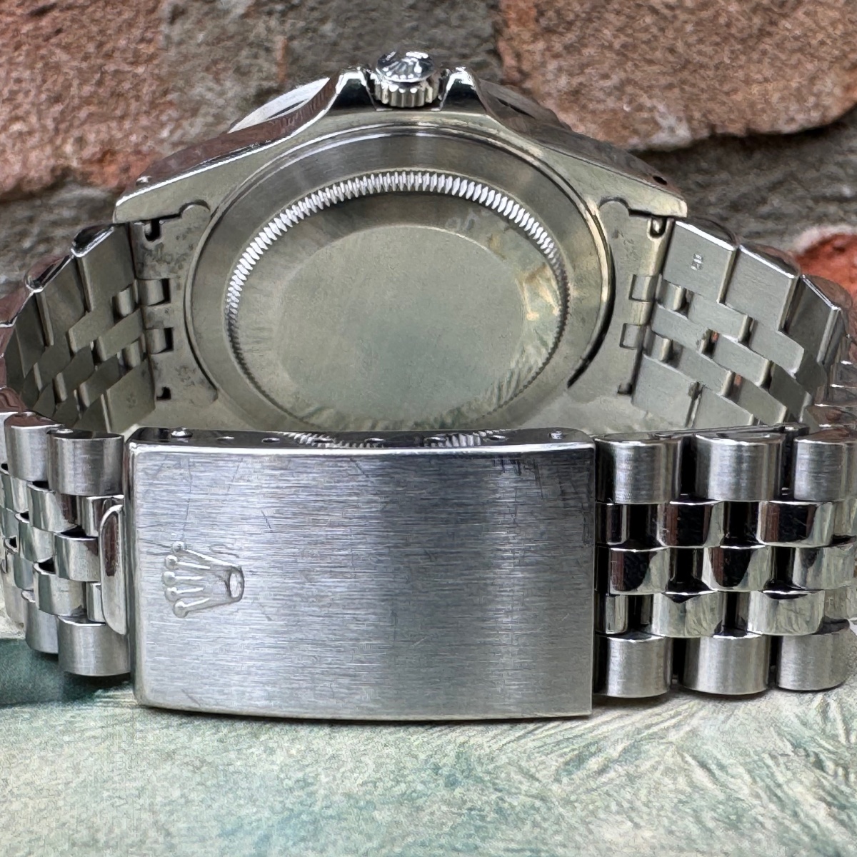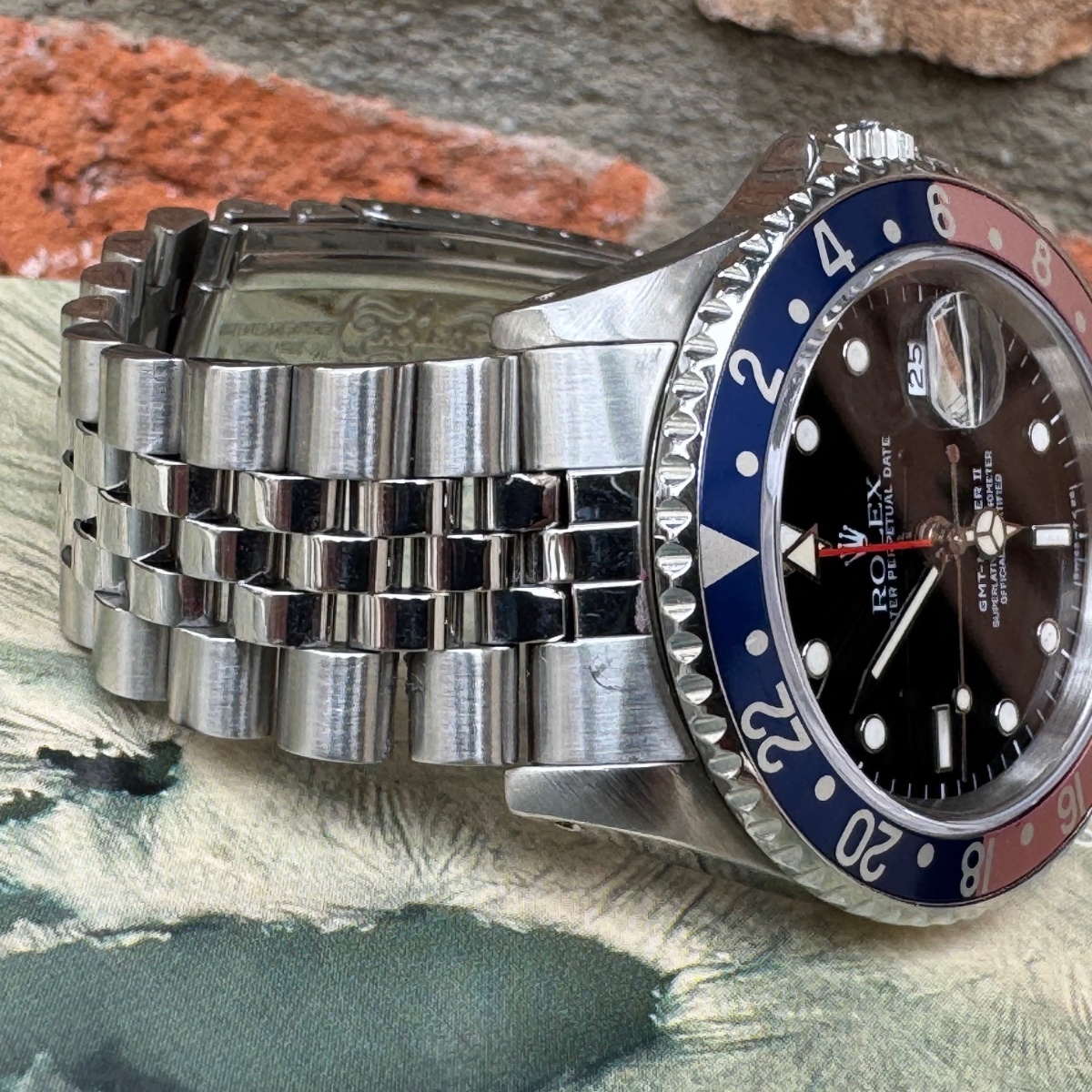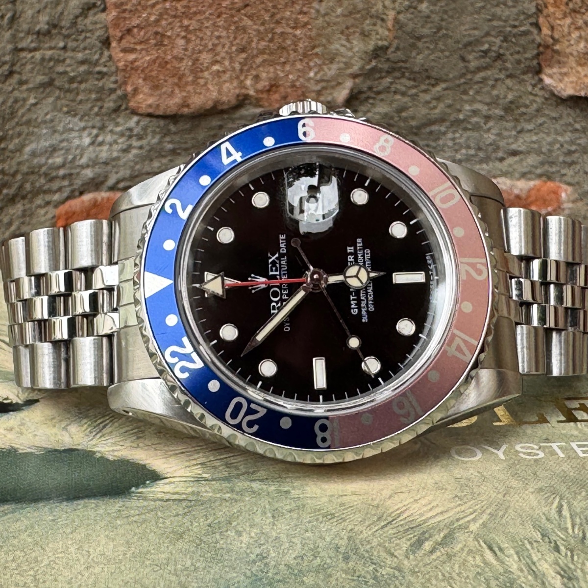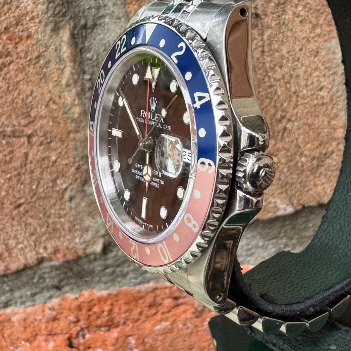 orologio da considerarsi ormai "vintage" in condizioni reali ottime, con spettacolare lunetta 'faded' (scolorita in maniera naturale ed uniforme) originale e coeva e bracciale jubilè originale del modello con ultima maglia marchiata 50 e finali 502t. Completo di scatola originale e Service Card Rolex ancora con 1 anno di garanzia ufficiale sul servizio di manutenzione di recente eseguito e documentato (no garanzia originale Rolex) |