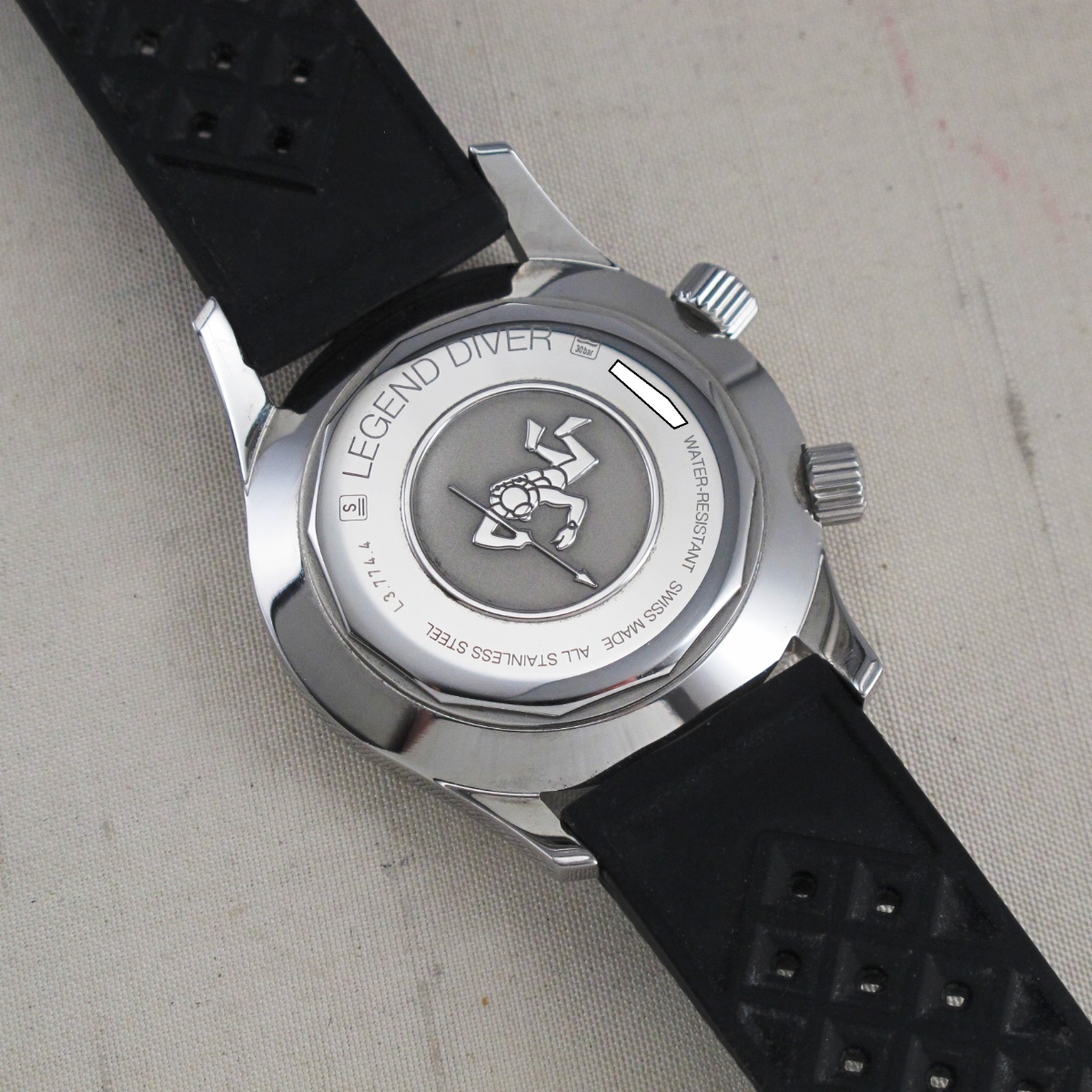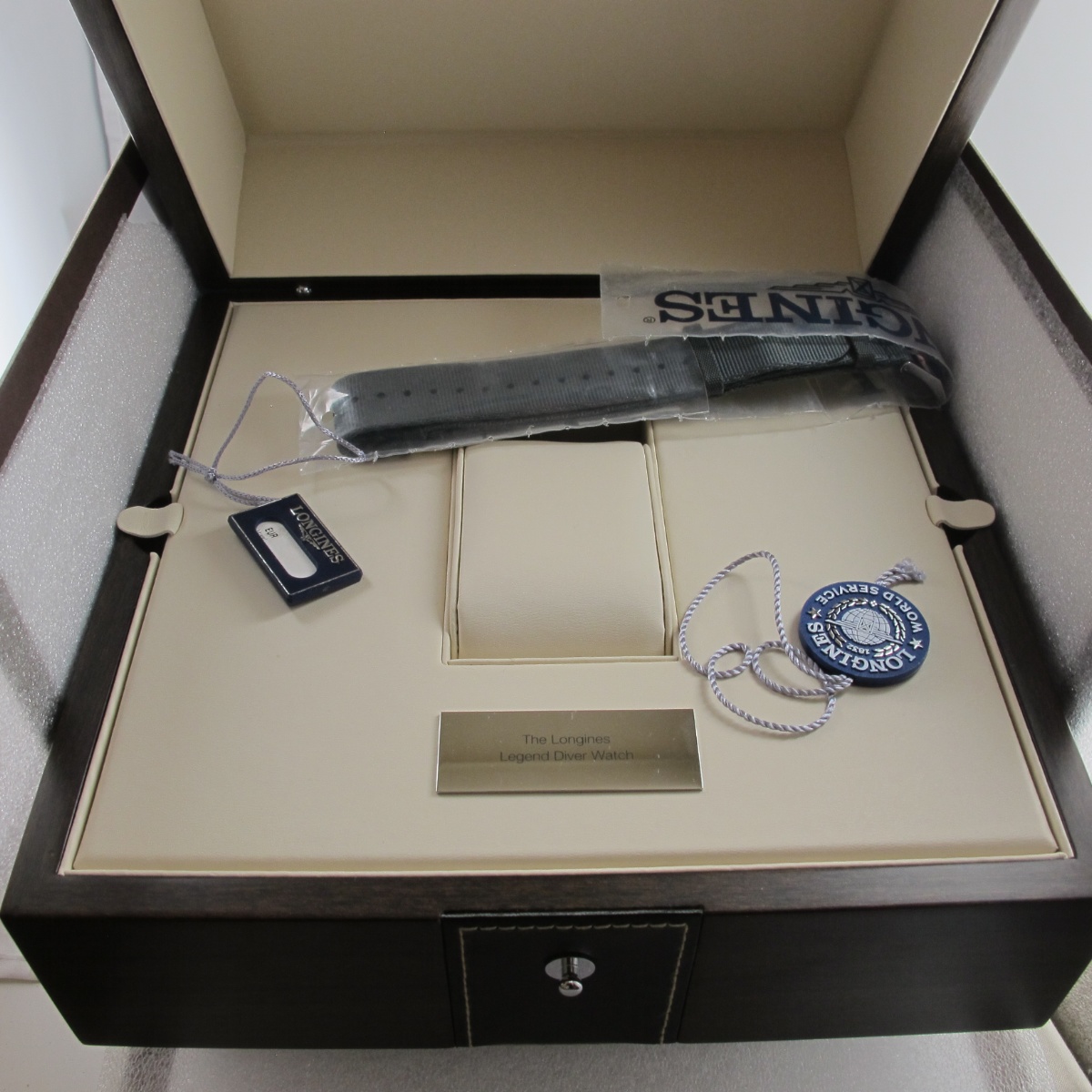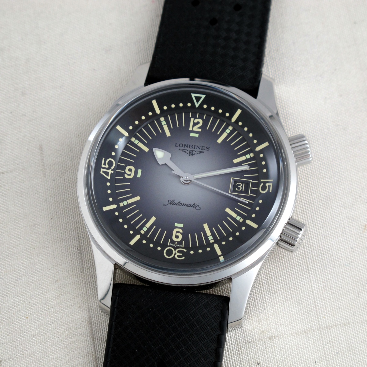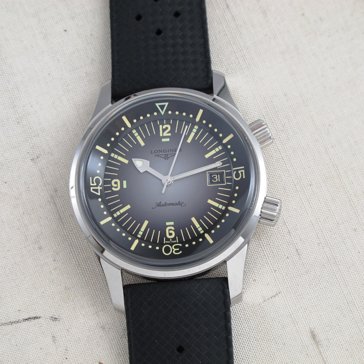 Longines Legend Diver Watch full set in ottime condizioni. L3.774.4.70.2 Cassa in acciaio di 42 mm di diametro. Impermeabilit 300 metri. Vetro zaffiro antigraffio bombato con trattamento antiriflesso. Fondello avvitato. Rehaut interno girevole da sub, Corona a vite. Movimento meccanico a carica automatica L633, Cinturino in gomma _ cinturino nato Scatola e garanzia