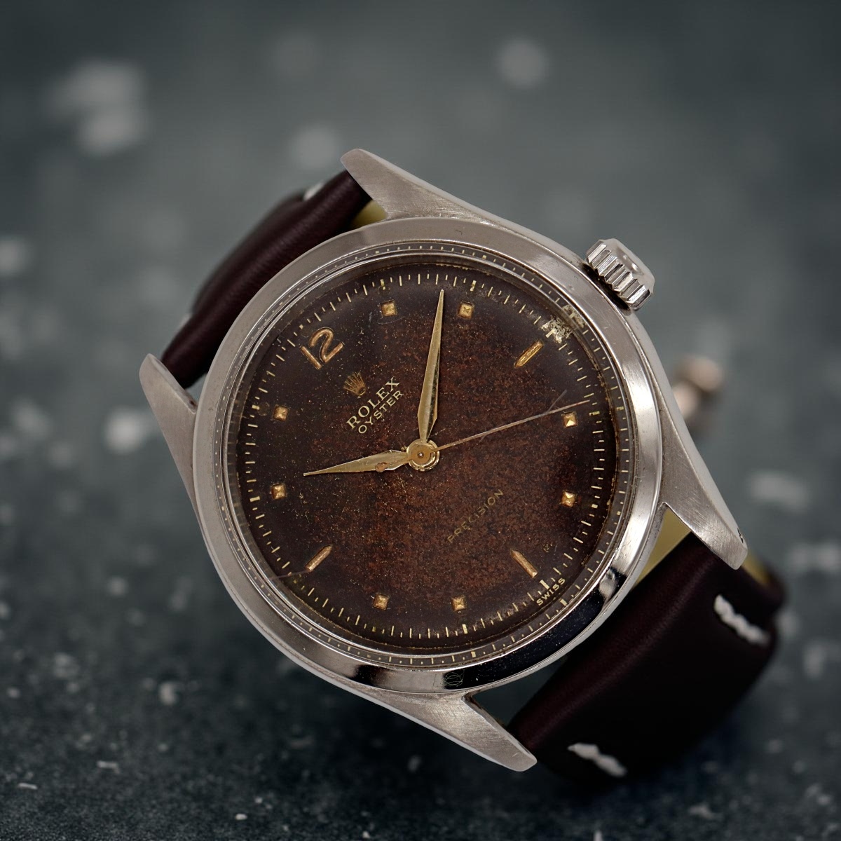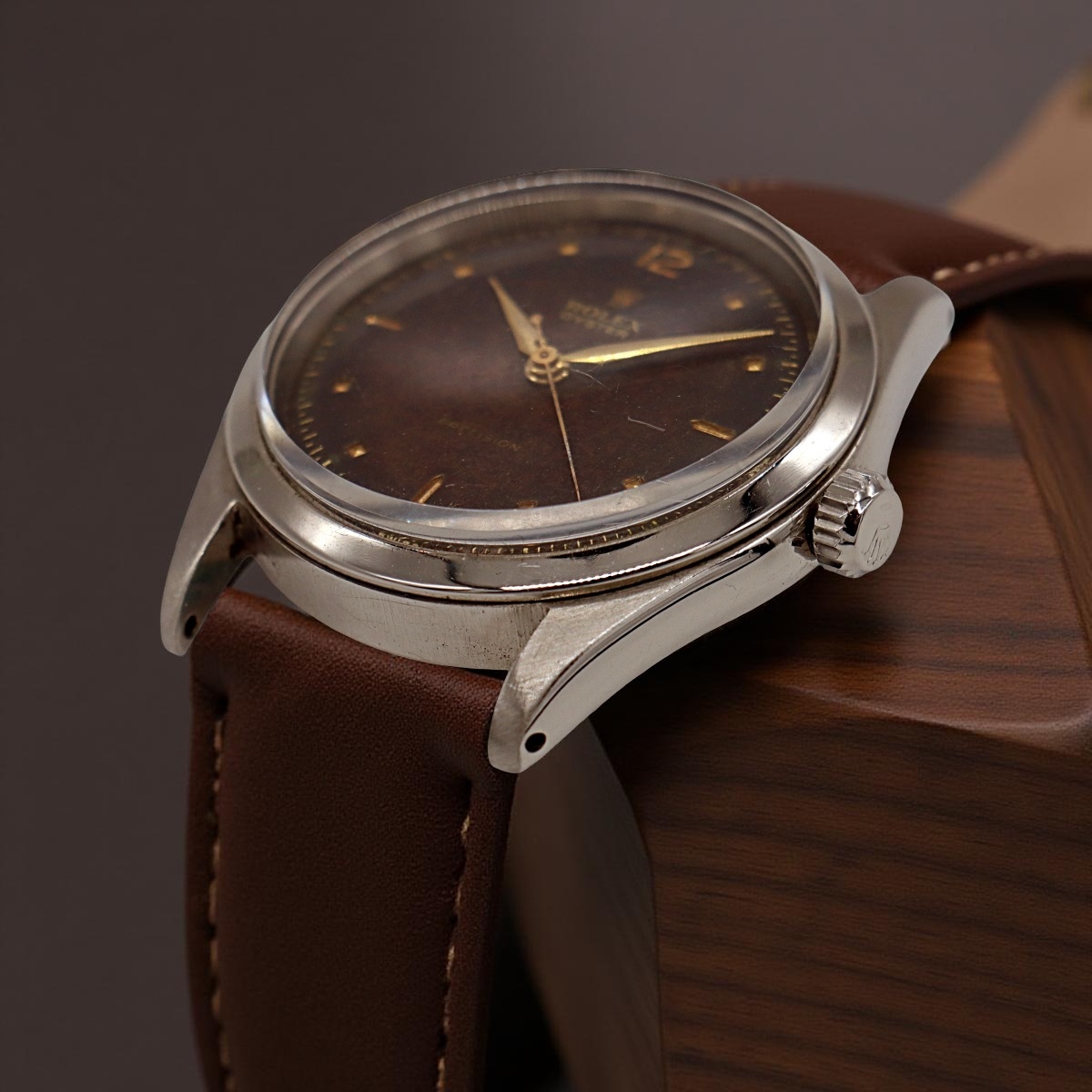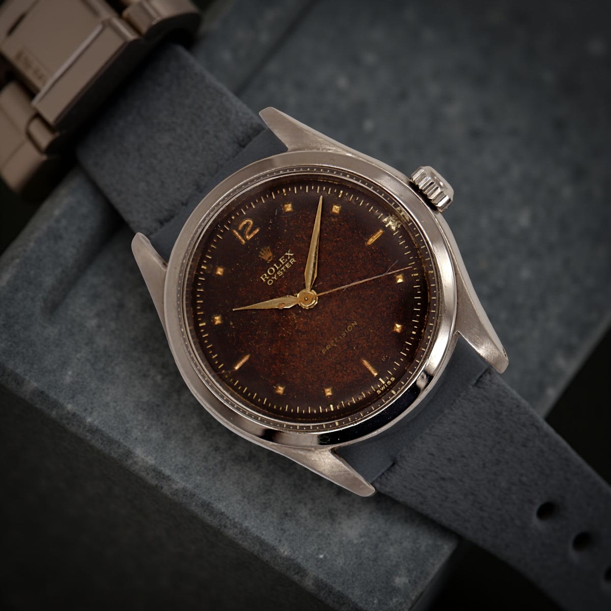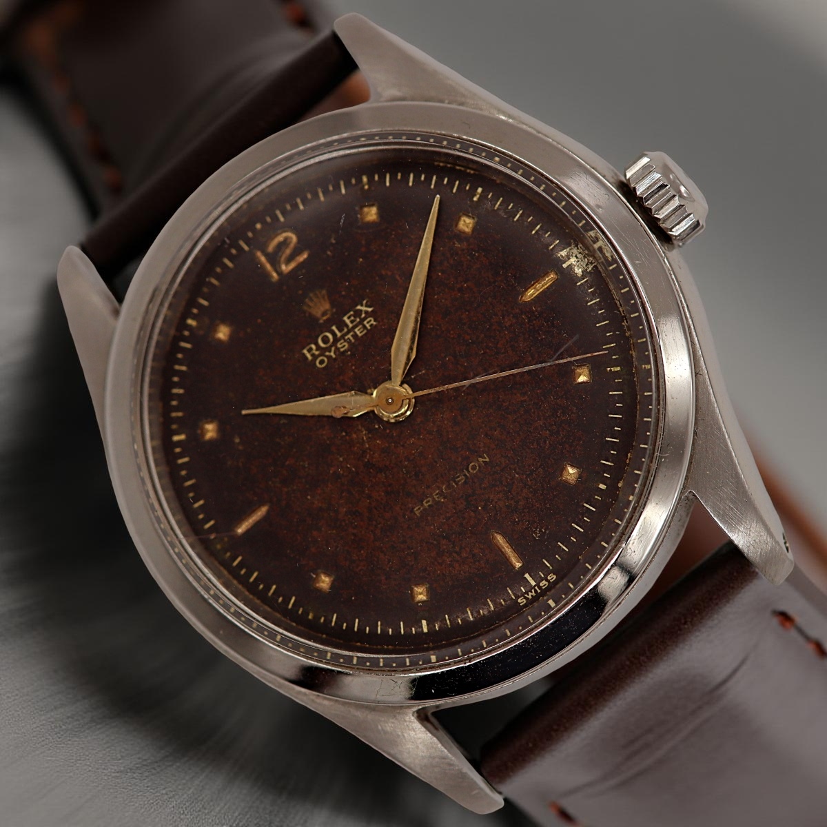 Rolex Oyster Precision steel wristwatch with black dial with brown accents and gold hands and indexes, reference 6482 with case number 67xxx, manual winding number 43xxx, year 1955