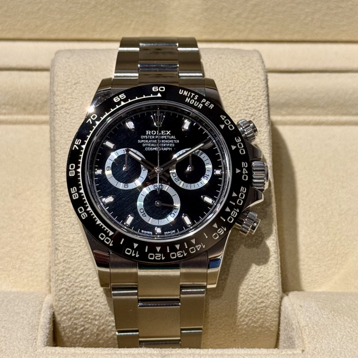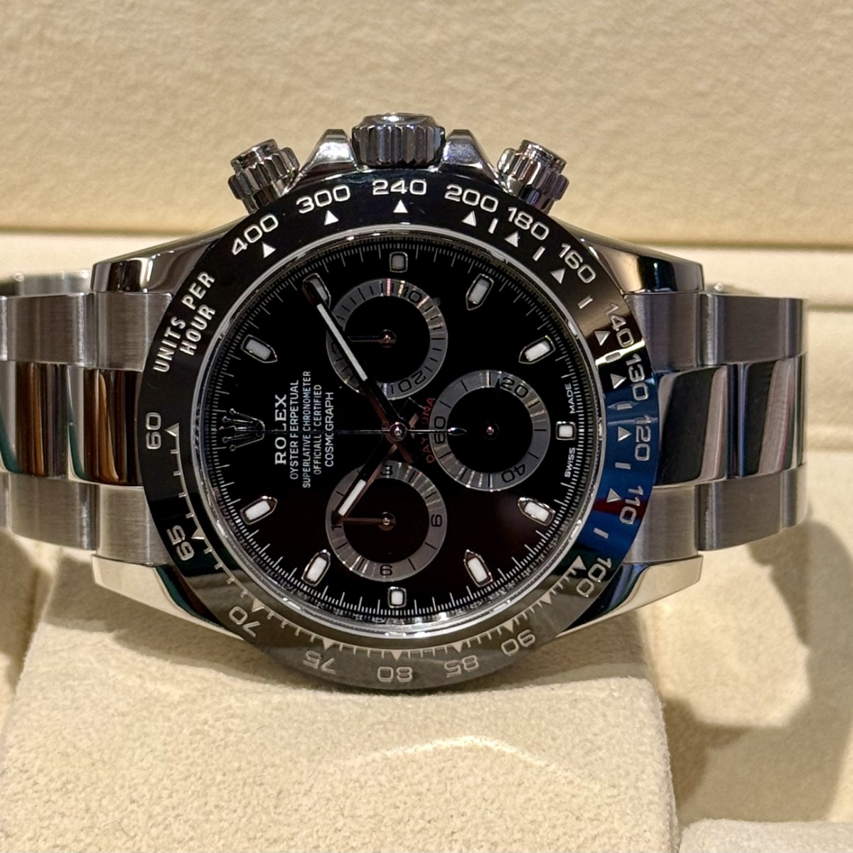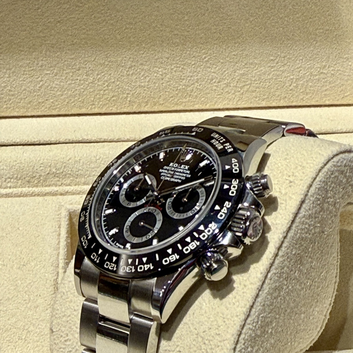 Primo Daytona prodotto con la ghiera in ceramica,referenza fuori produzione. Orologio pari al nuovo completo di scatola e garanzia. |