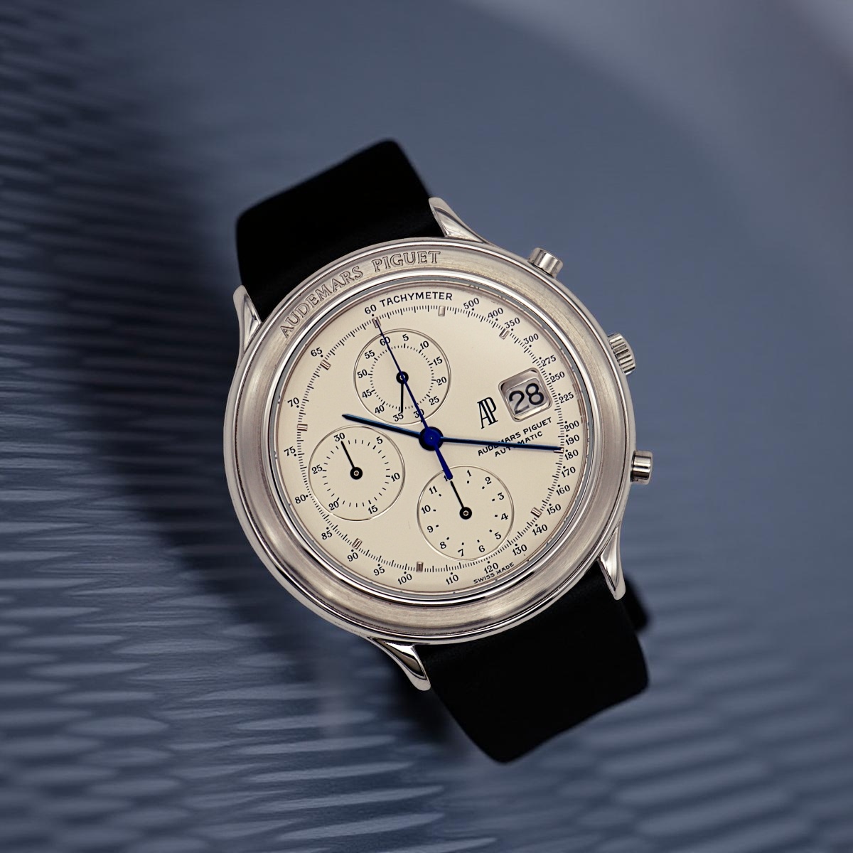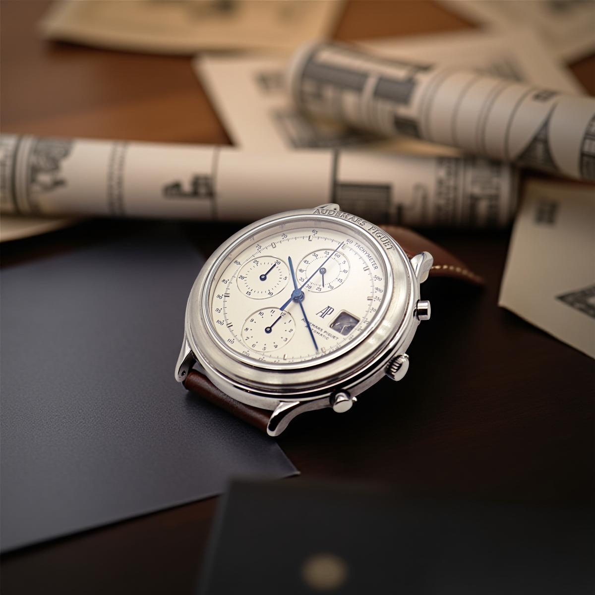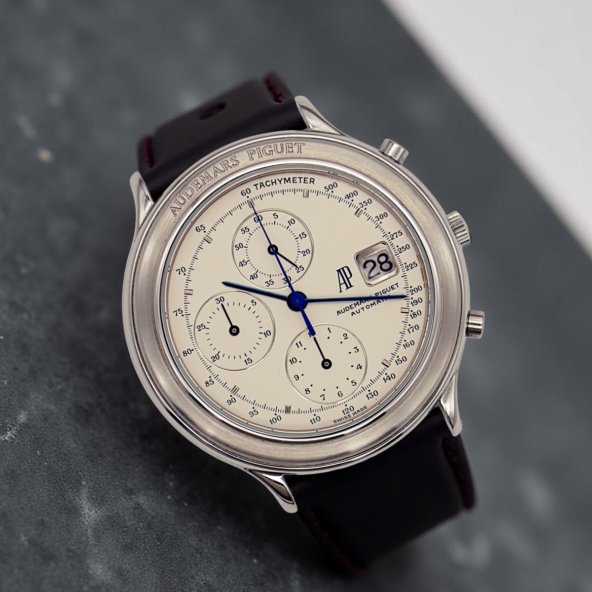Three-counter wrist chronograph with date and pump buttons, stainless steel with original papers