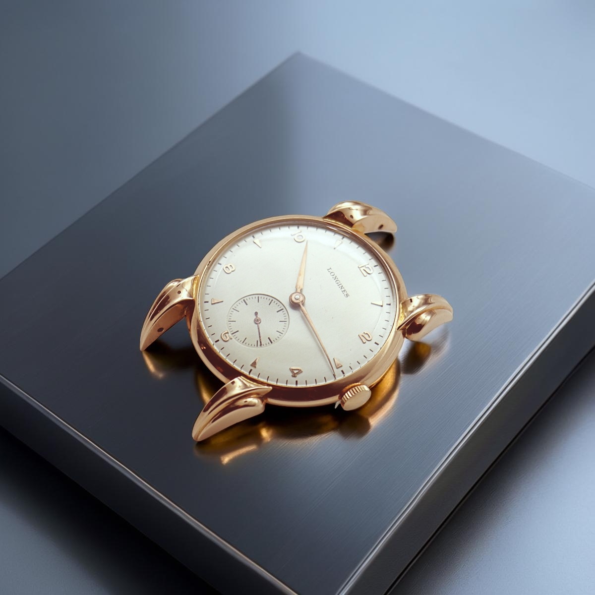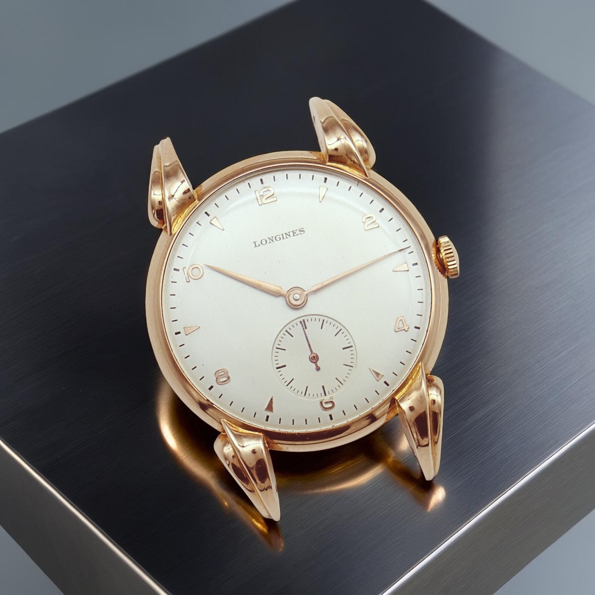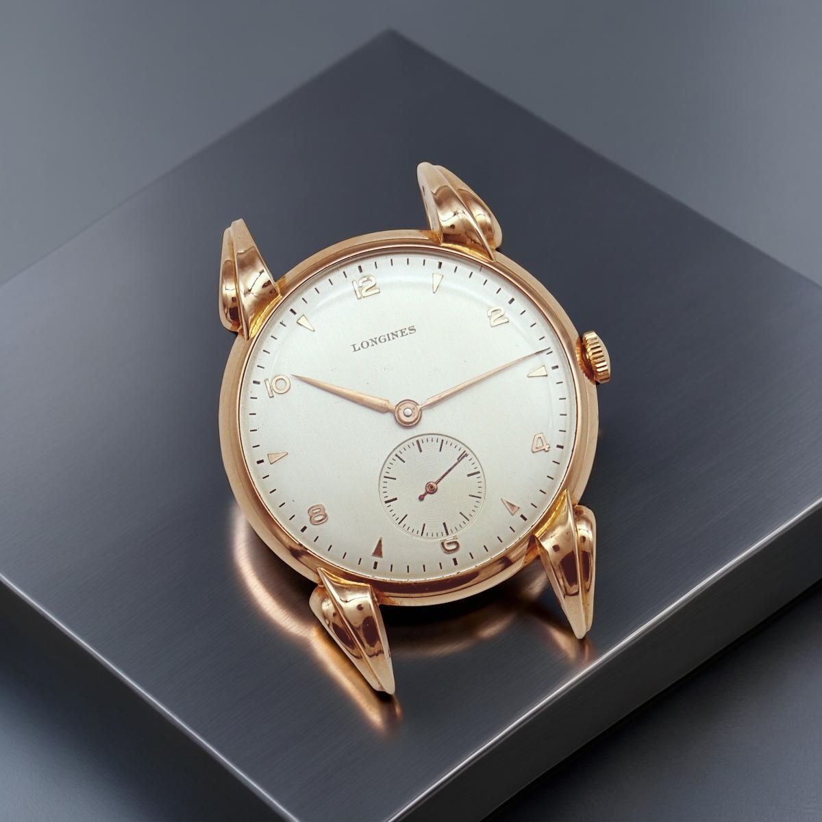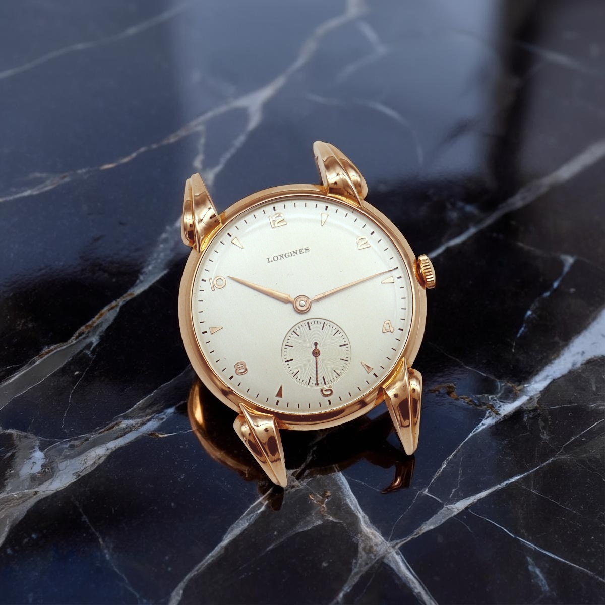 Rare rose gold Longines with double spider lugs, dial with applied indexes and small seconds at six o' clock. Reference 5521 number 287, manual winding caliber 27M, new old stock and full set, year 1949 |