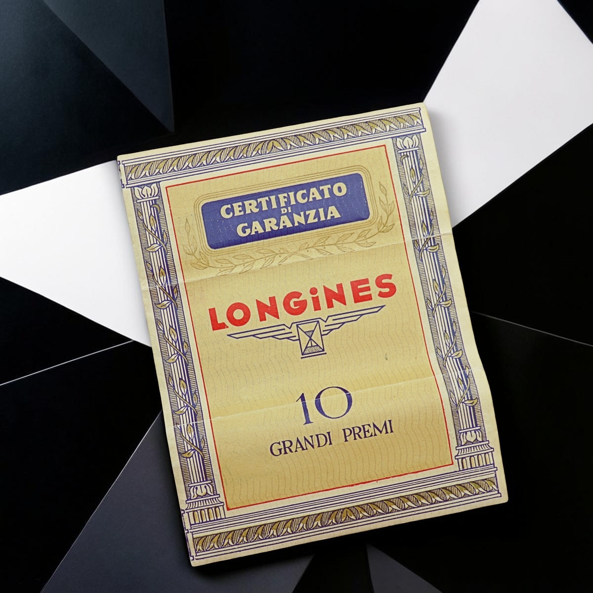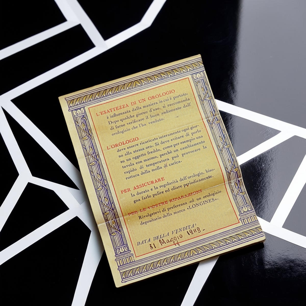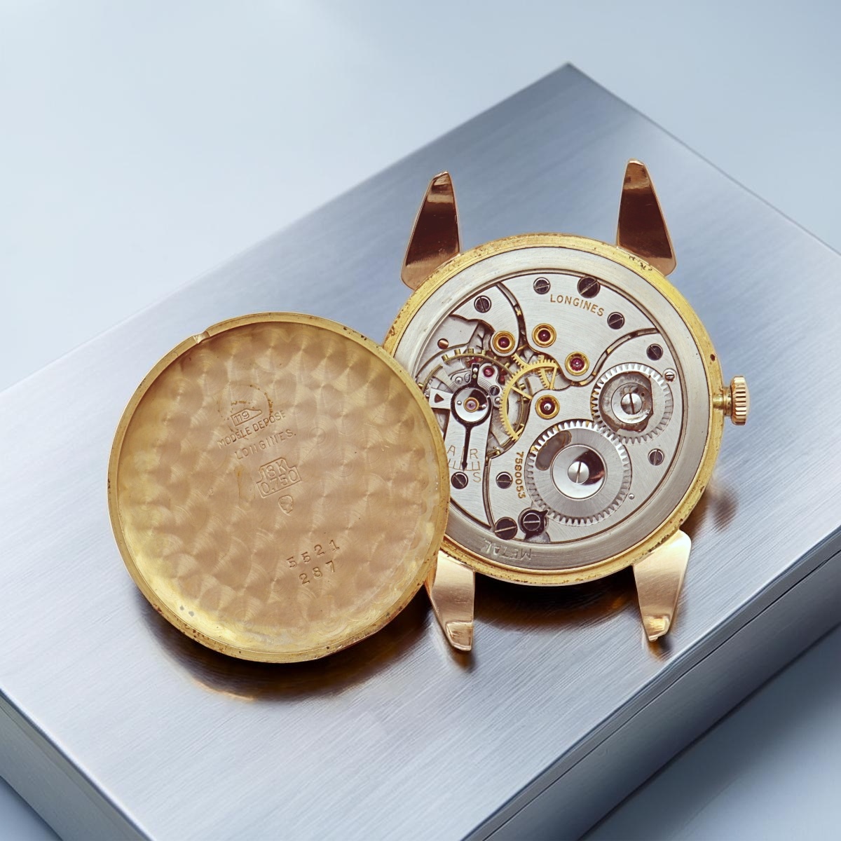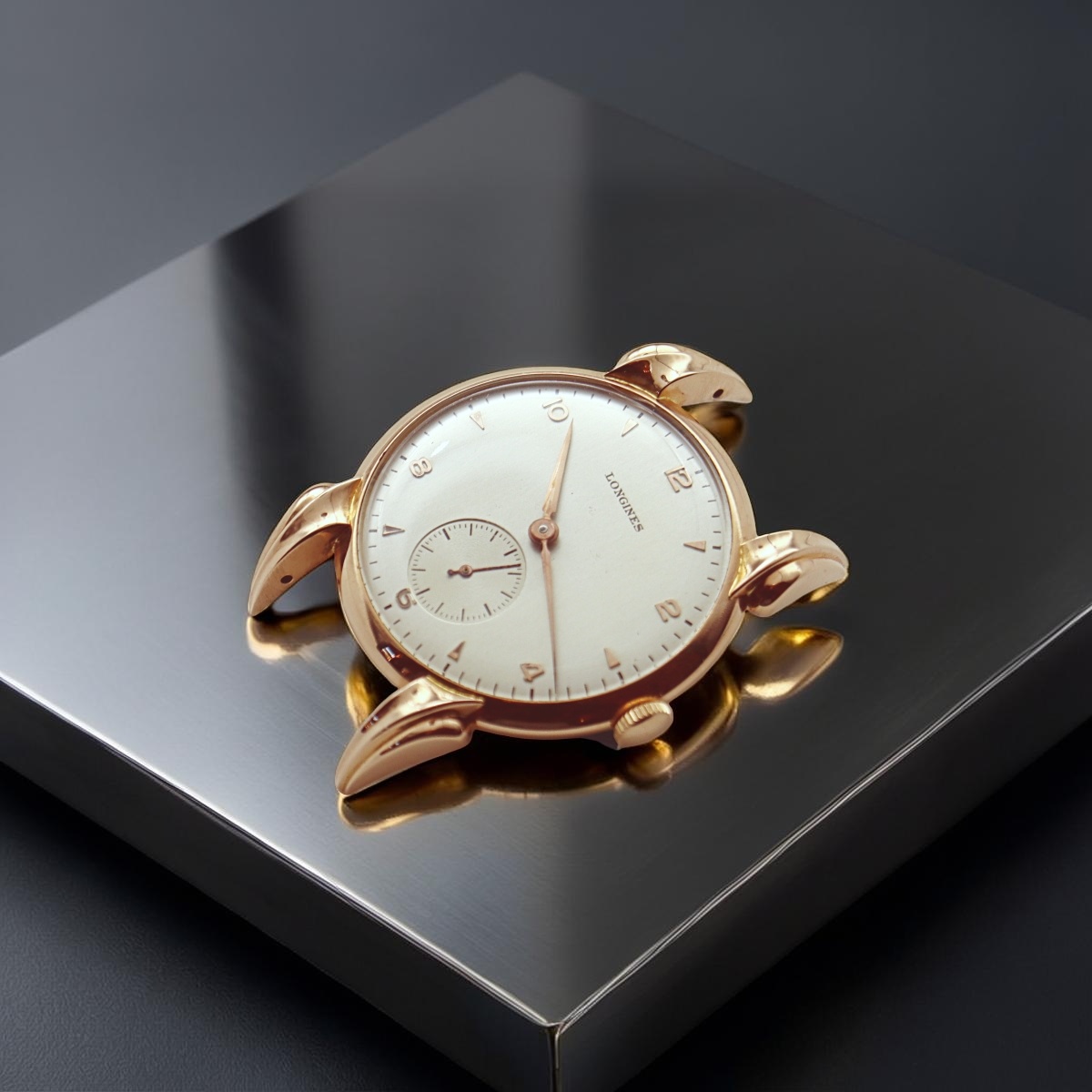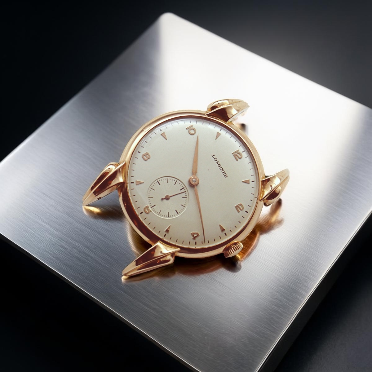 Rare rose gold Longines with double spider lugs, dial with applied indexes and small seconds at six o' clock. Reference 5521 number 287, manual winding caliber 27M, new old stock and full set, year 1949 |