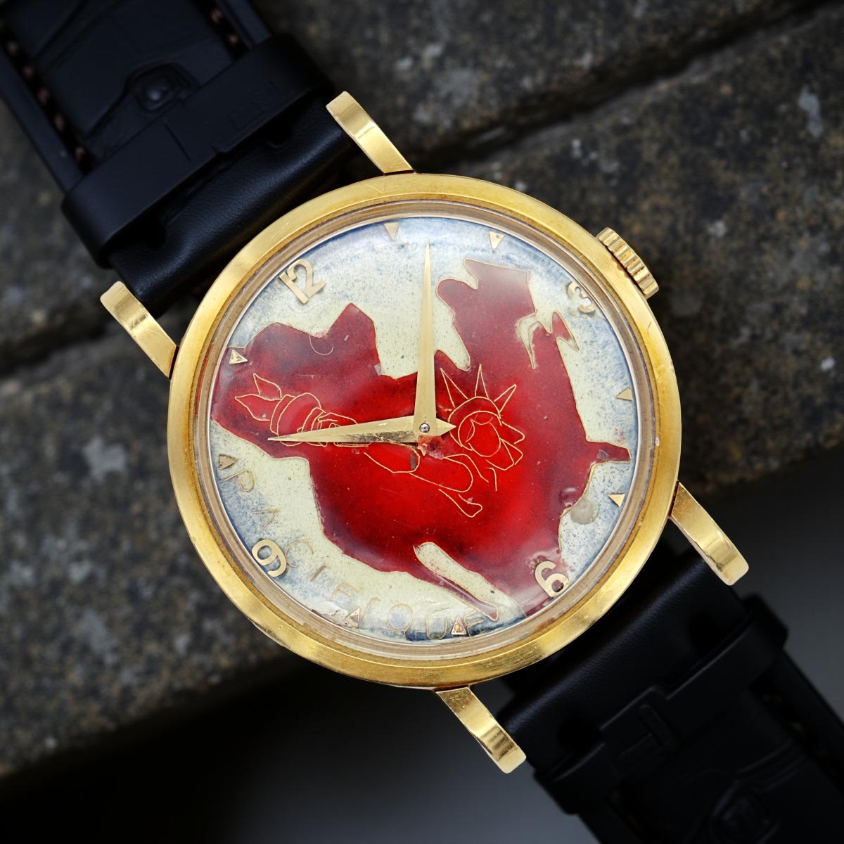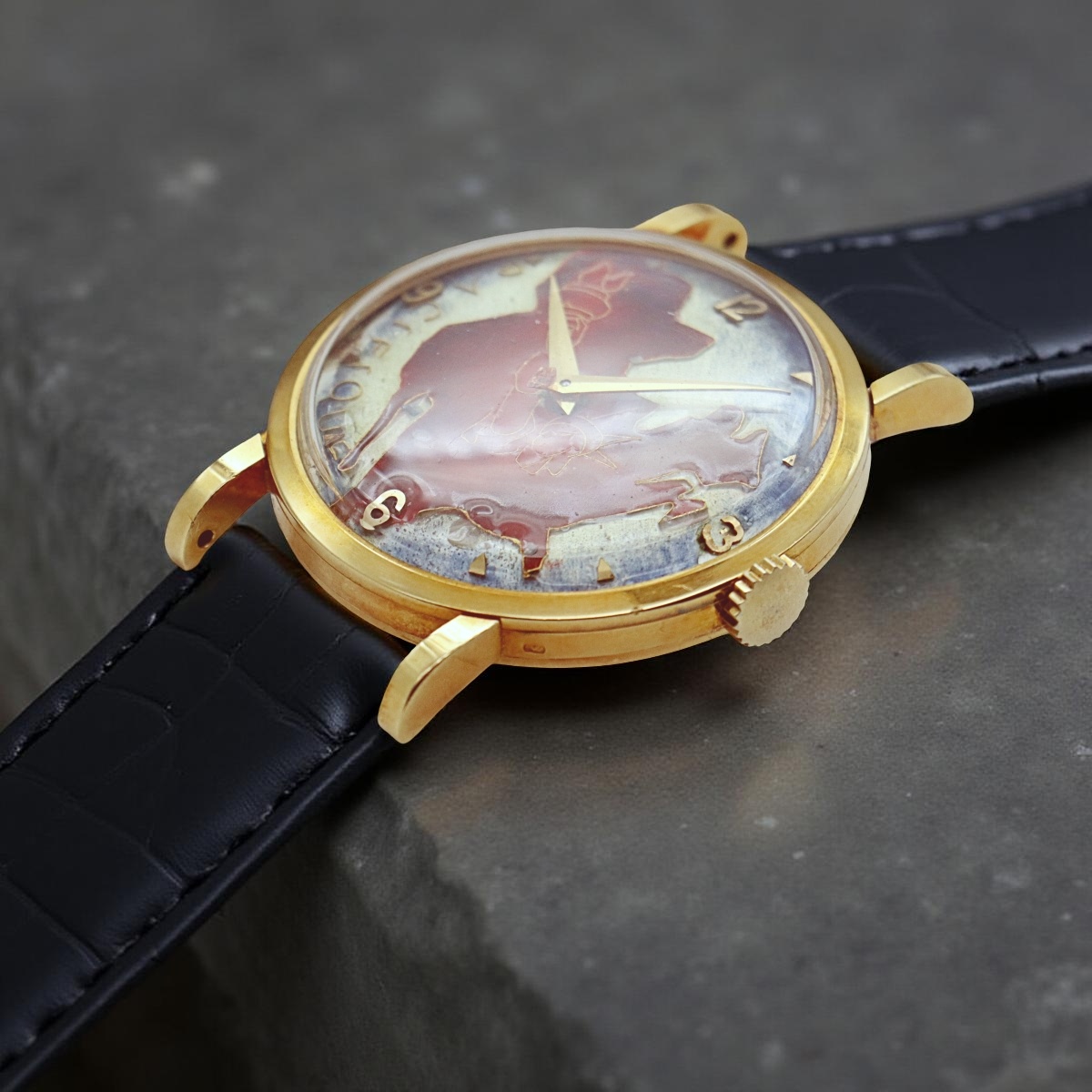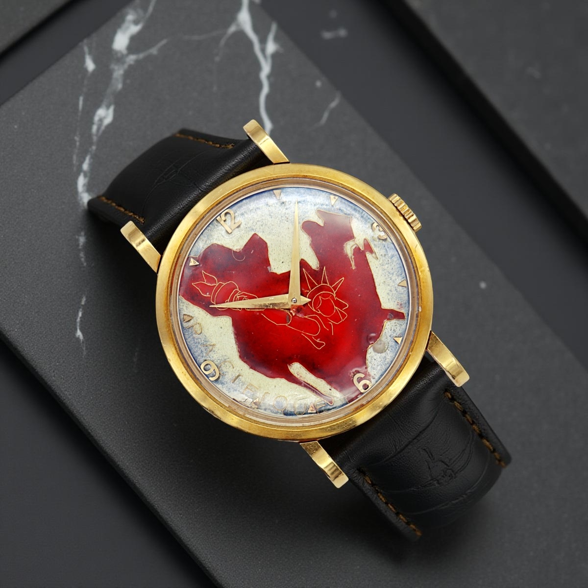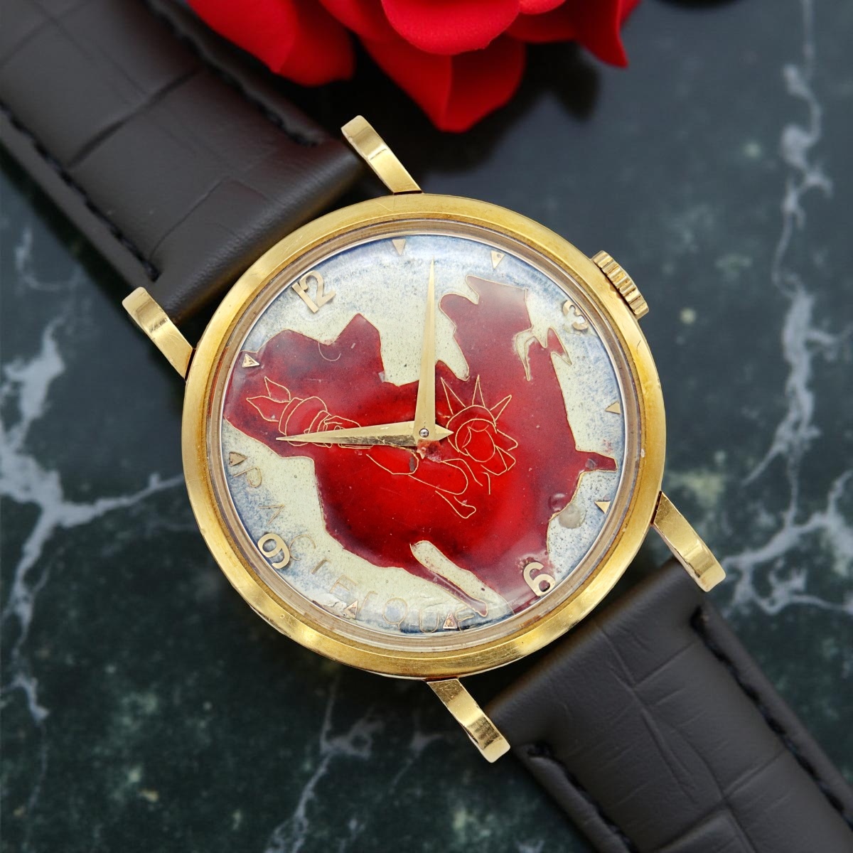 Extremely rare yellow gold Universal Geneve wristwatch with enamel dial depicting the Statue of Liberty. Reference 112167, case number 1437xxx, manual winding caliber 262, year 1950 |