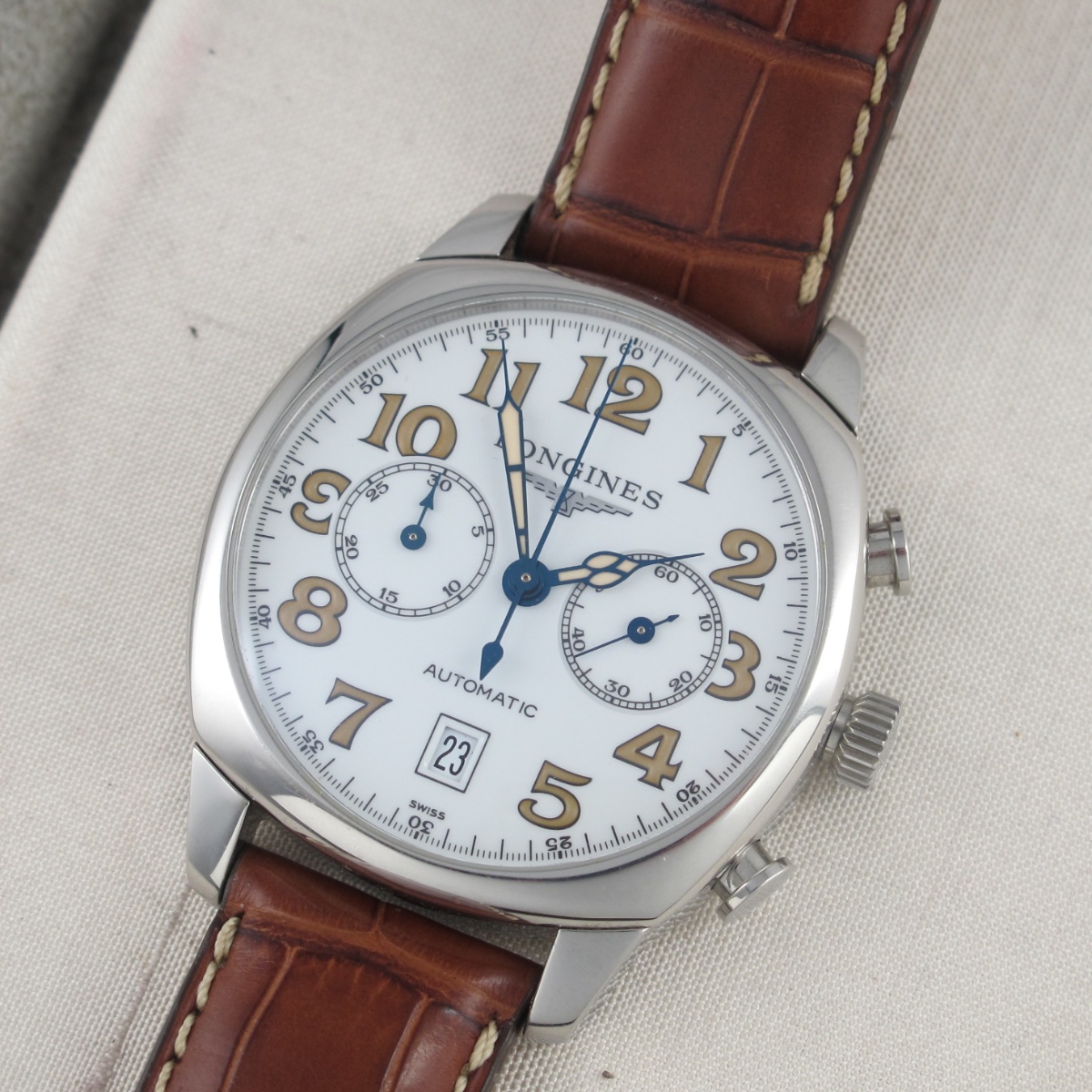Bellissimo Longines Spirit Automatic Chronograph full set 2009 in condizioni super. Ref. L2.705.4.23.2 Cassa in acciaio 40 mm. Movimento automatico Cinturino in pelle marrone con fibbia. Scatola e garanzia |