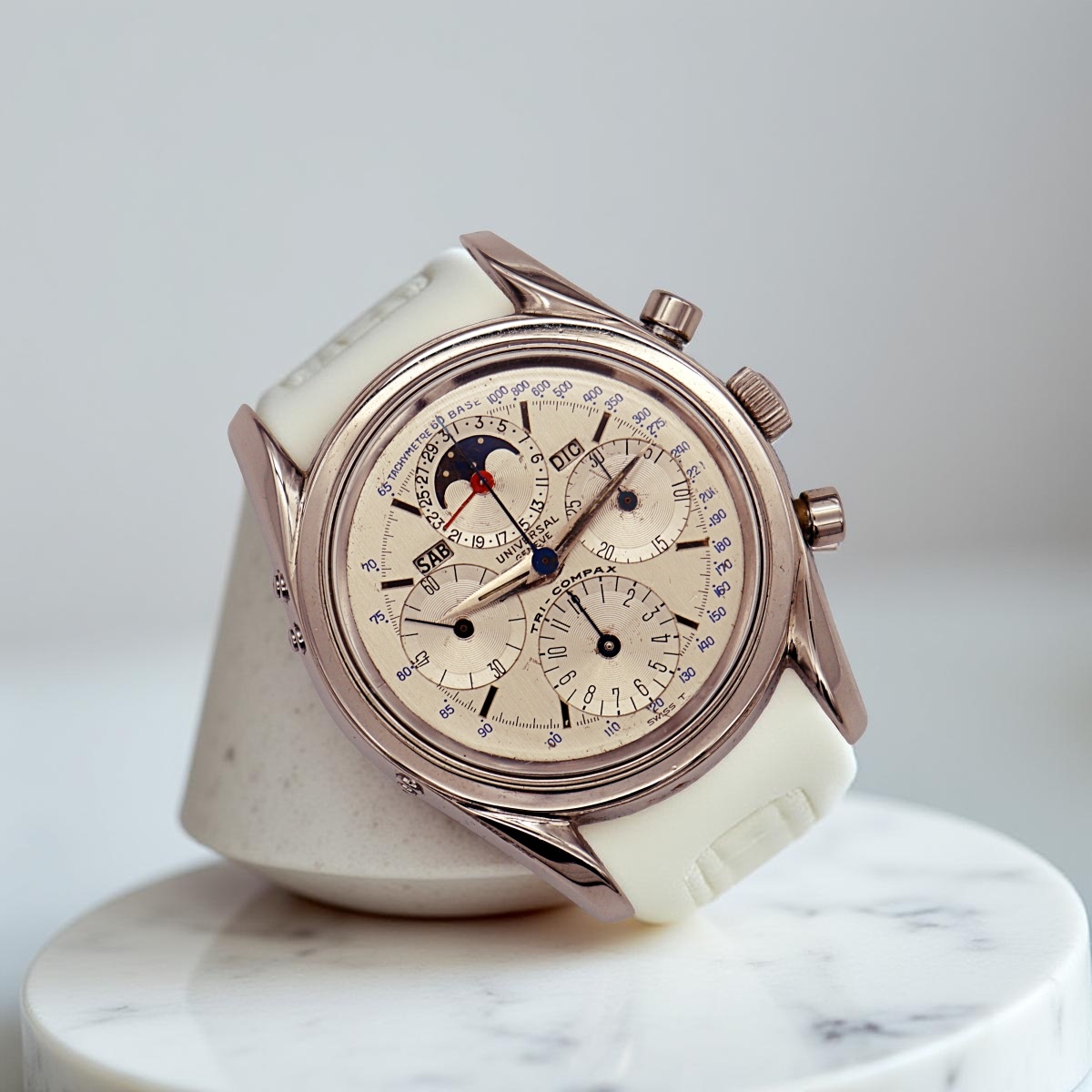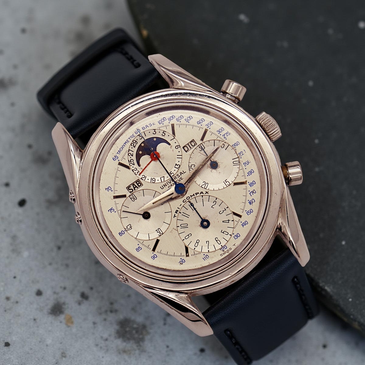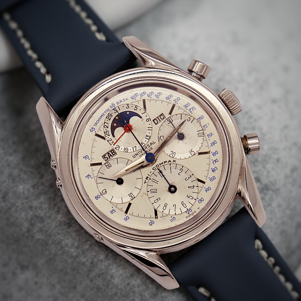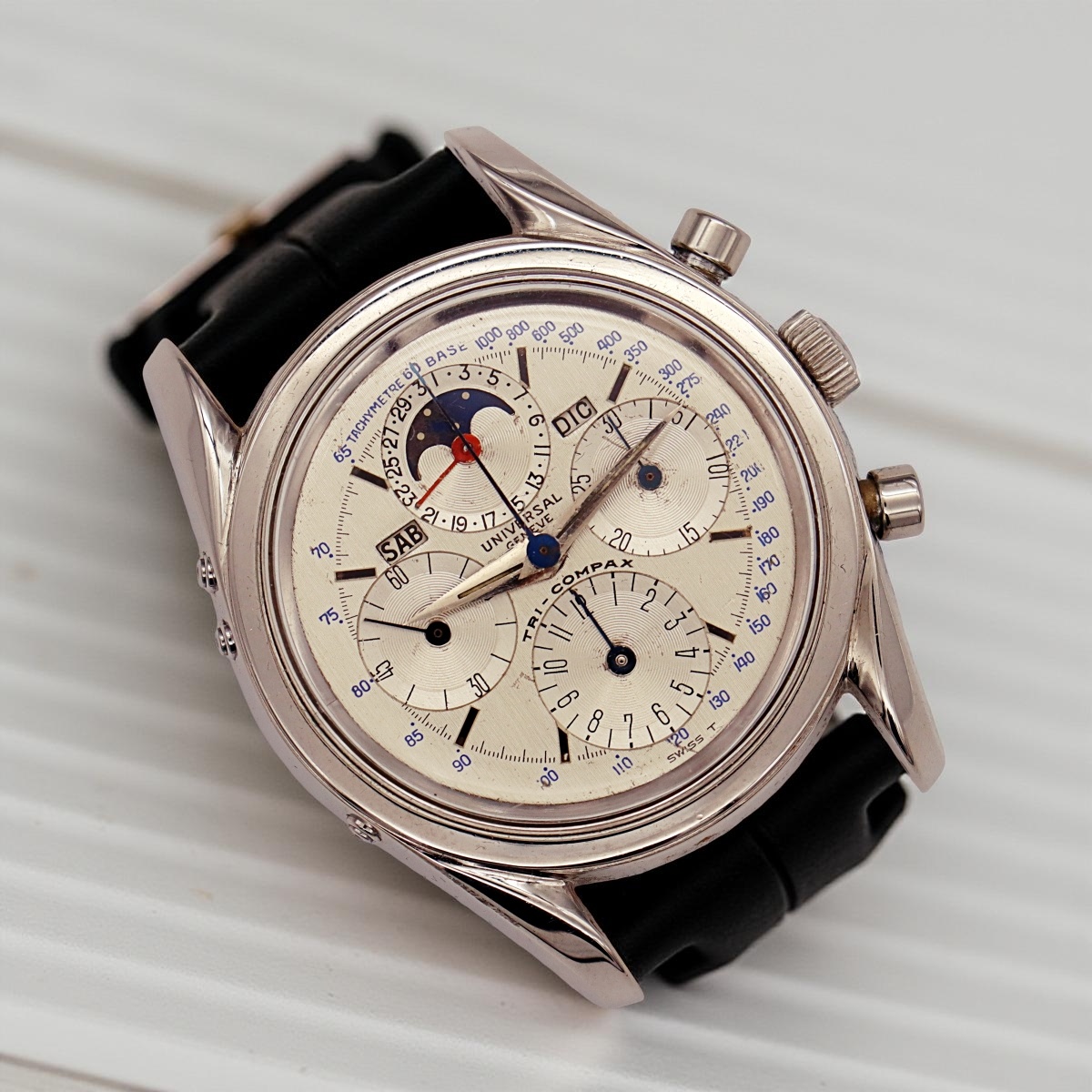 Universal Geneve steel full calendar moon phase wrist chronograph. Reference 222100/2, case number 233xxxx, manual winding movement cal. 281, screw-down case and pump chronograph buttons, year 1950 |
