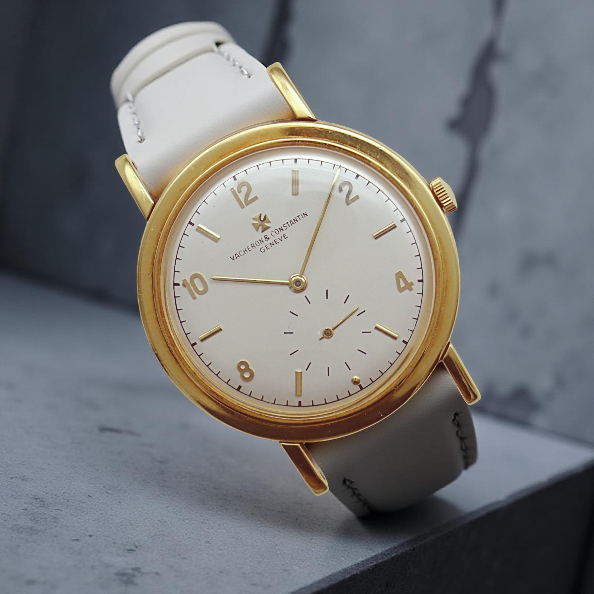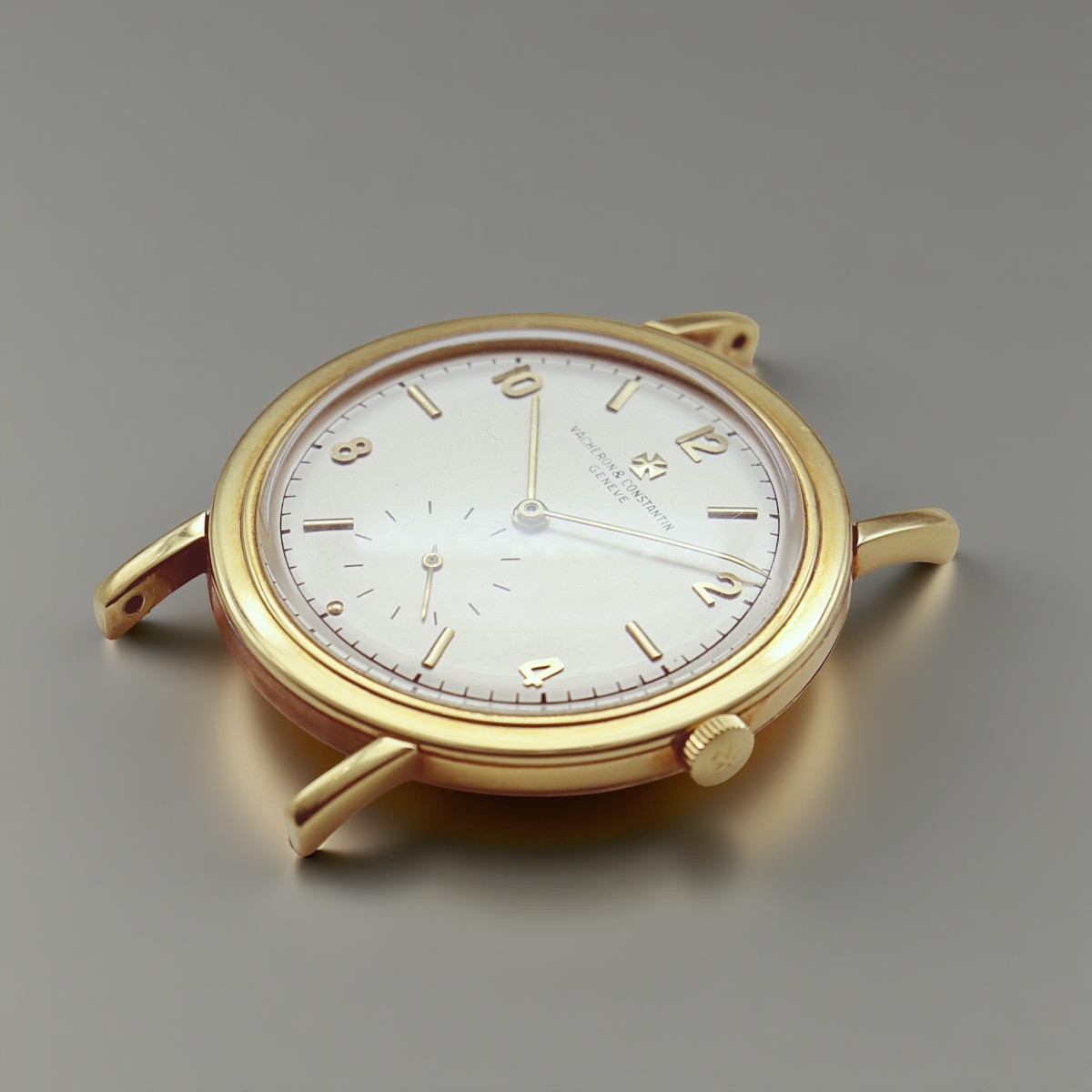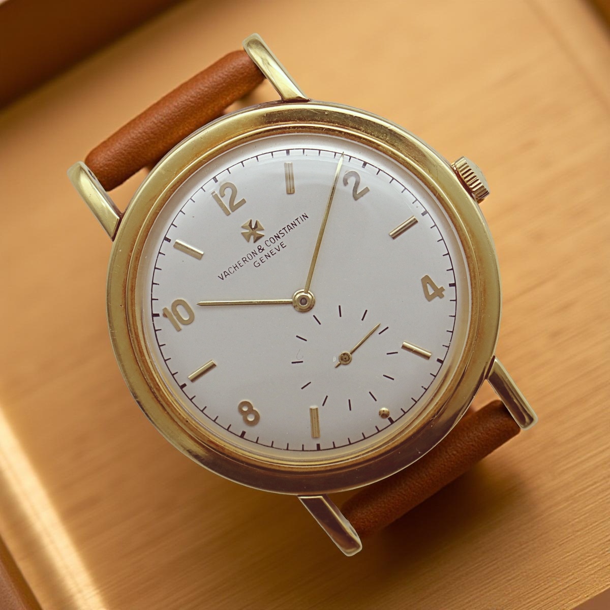 Large 18kt yellow gold Vacheron Constantin wristwatch with permanent dial and alternating indexes. Small seconds at six o' clock. Case number 325241, manual winding caliber P453/3B, year 1950 |