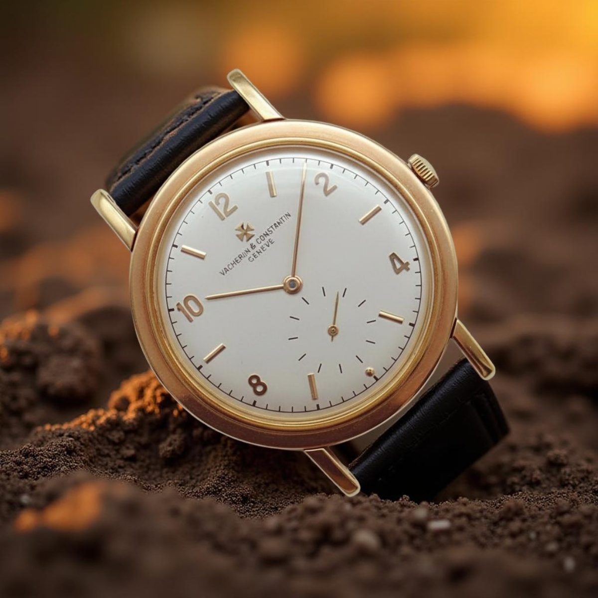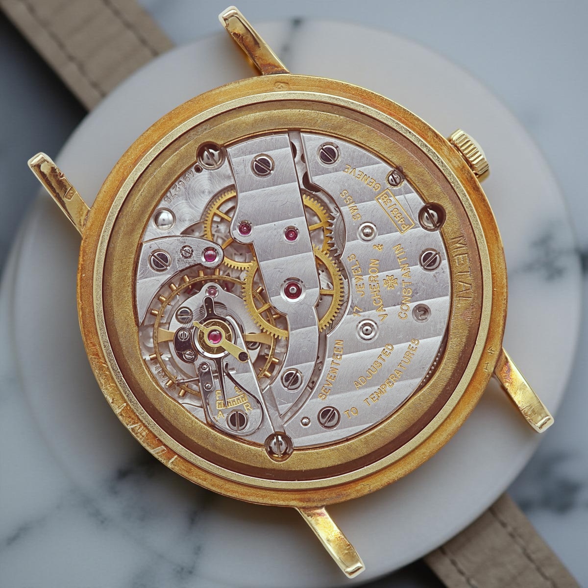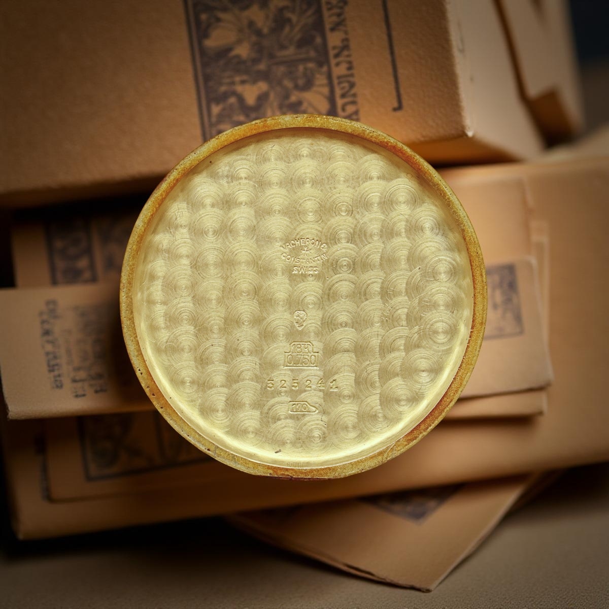 Large 18kt yellow gold Vacheron Constantin wristwatch with permanent dial and alternating indexes. Small seconds at six o' clock. Case number 325241, manual winding caliber P453/3B, year 1950 |