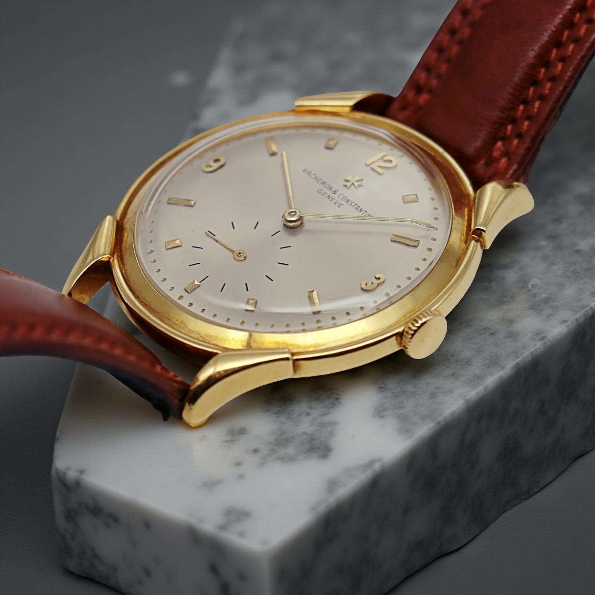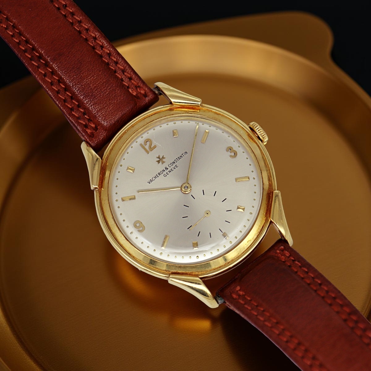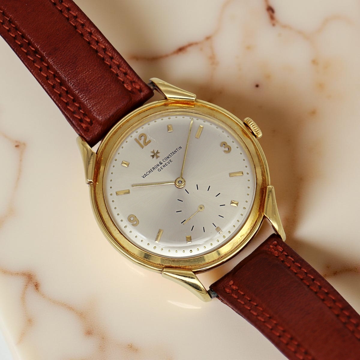 An attractive and rare oversized yellow gold wristwatch Vacheron Constantin with permanent dial and alternating indexes. Small seconds at six o'clock. Case number 337xxx, manual winding caliber P453/3B number 500881, year 1950 |
