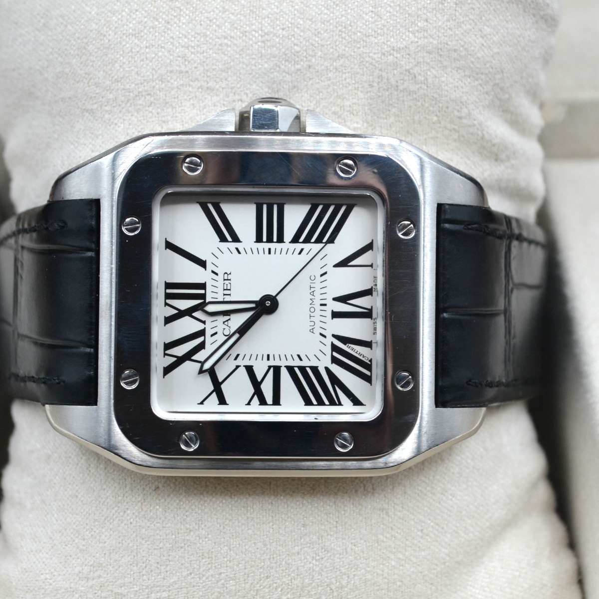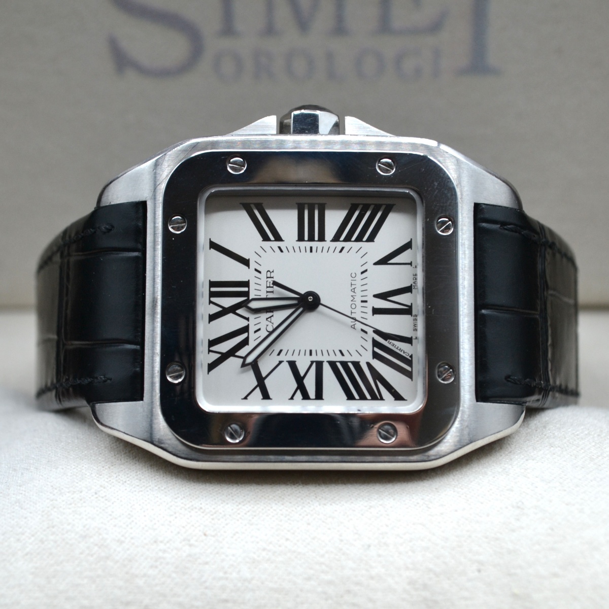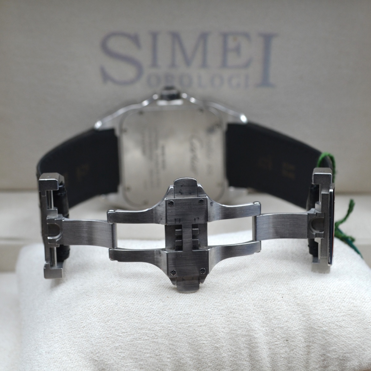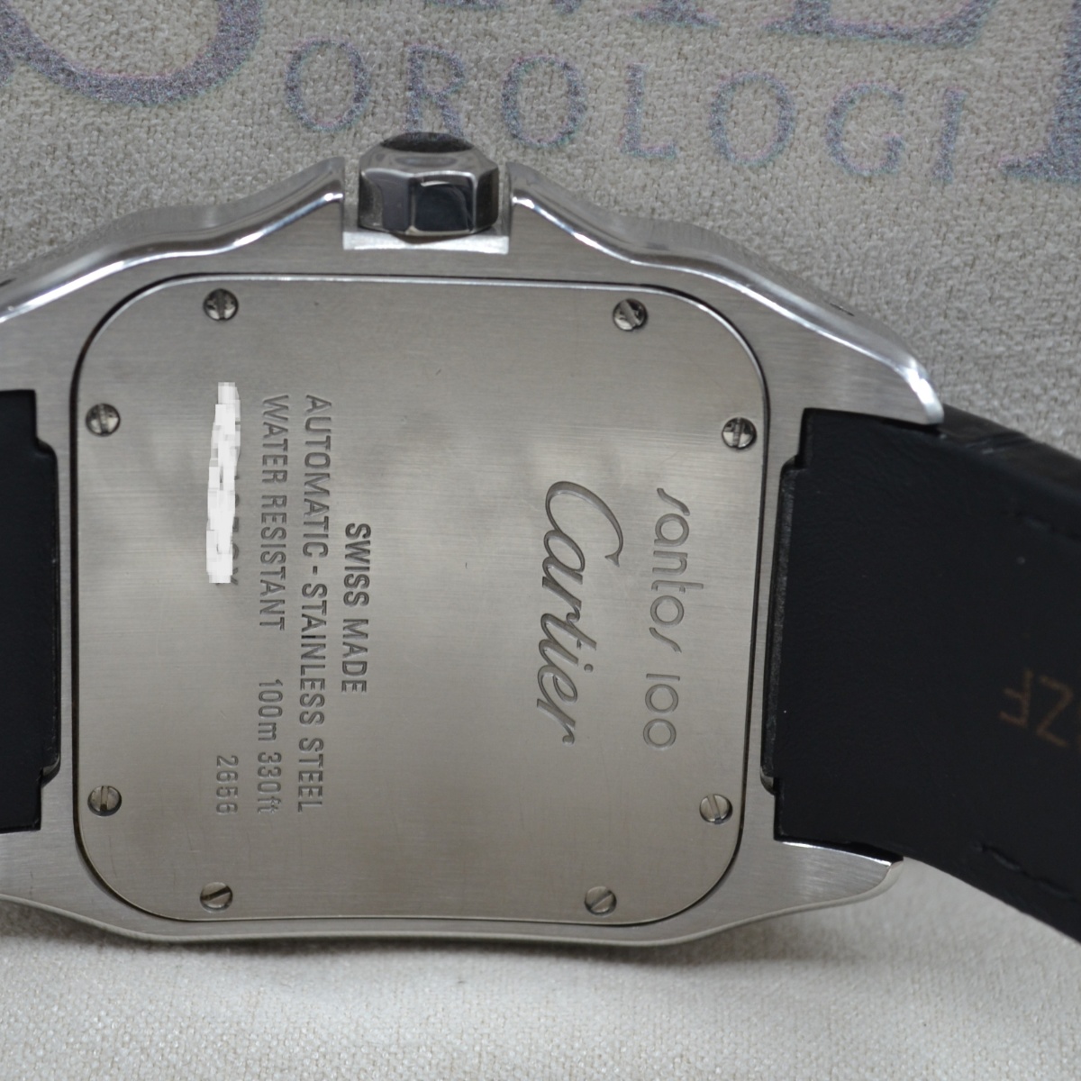 Cartier Santos 100 Misura XL Ottime condizioni Cinturino in pelle nera Cassa in acciaio Automatico Scatola e garanzia negozio |