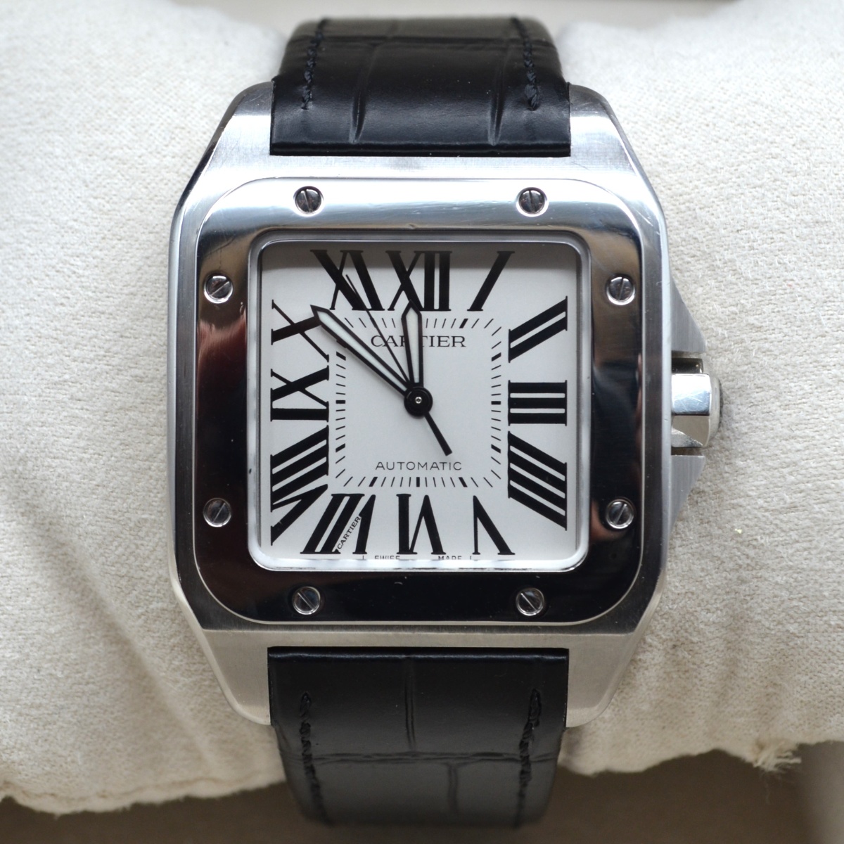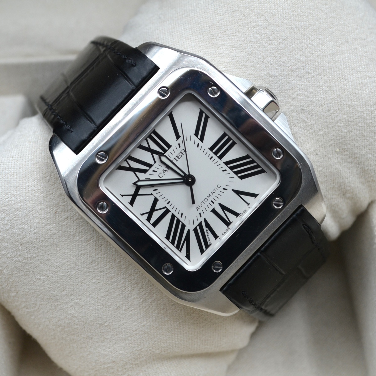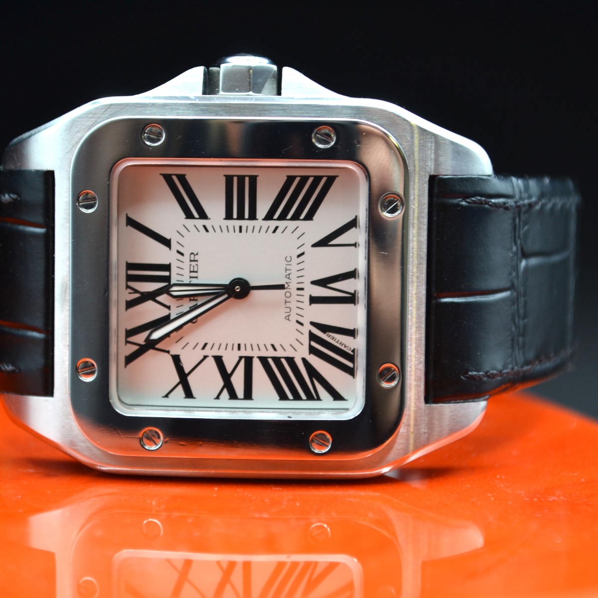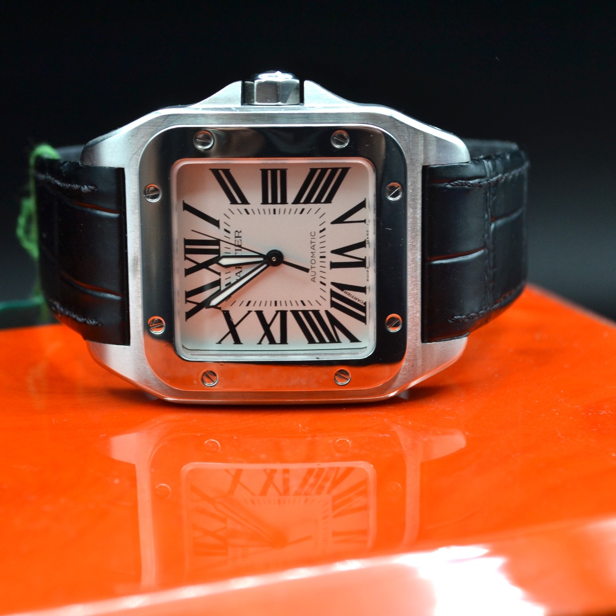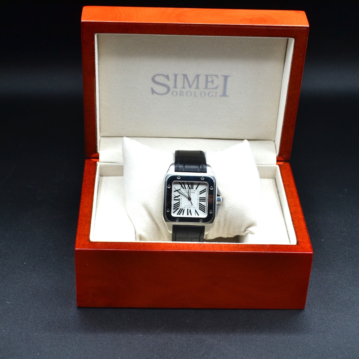 Cartier Santos 100 Misura XL Ottime condizioni Cinturino in pelle nera Cassa in acciaio Automatico Scatola e garanzia negozio |