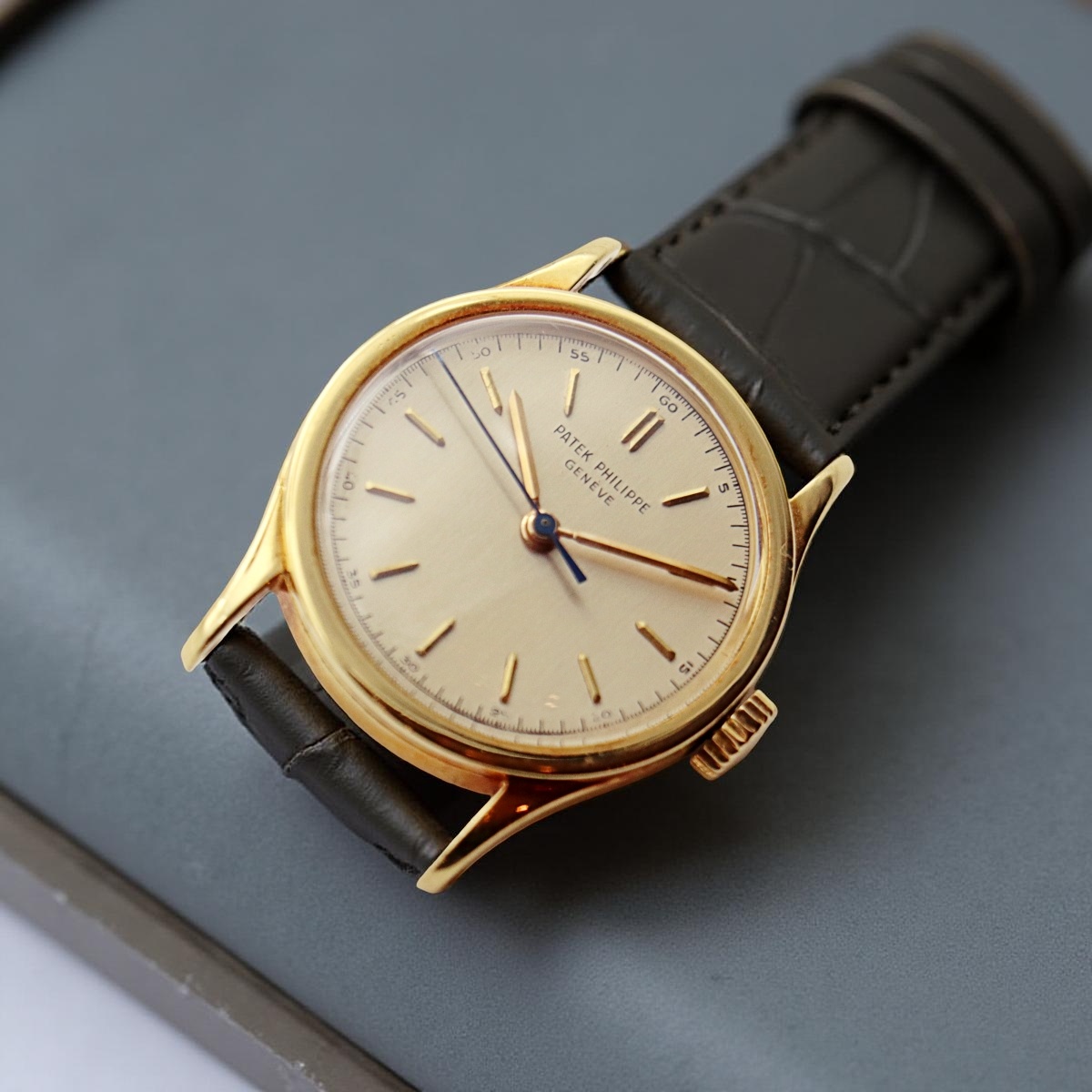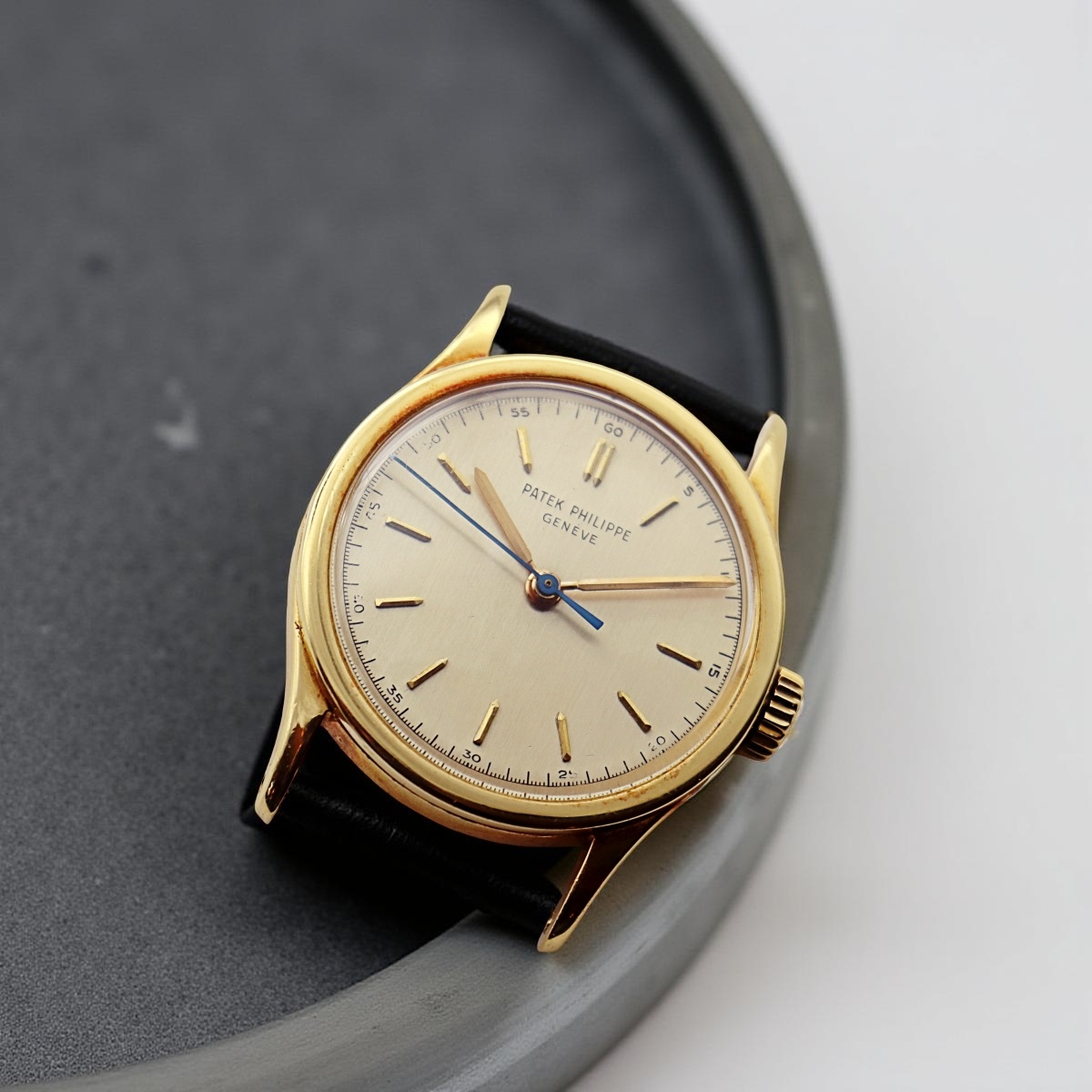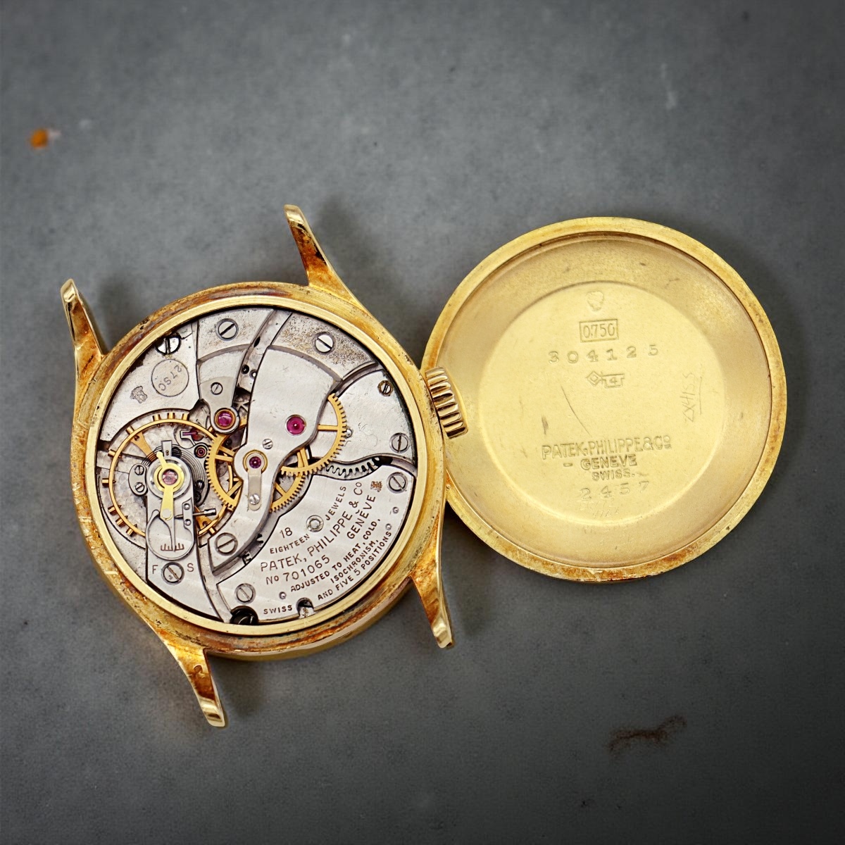 Patek Philippe Calatrava 2457 yellow gold wristwatch with central seconds, serial number 304125, manual winding caliber 12 27 SC, year 1951, case size 31mm, accompanied by Extract from the Patek Philippe archives |
