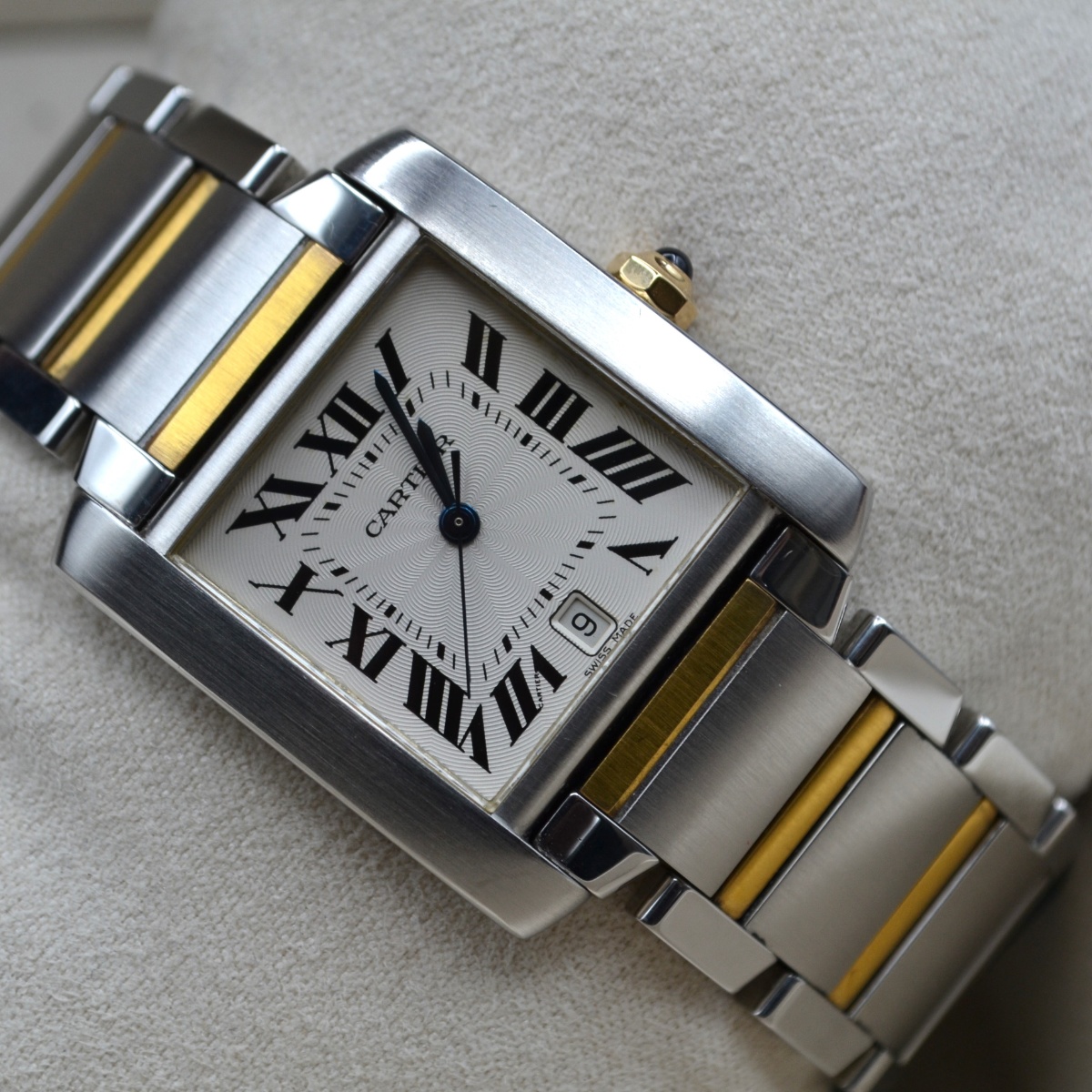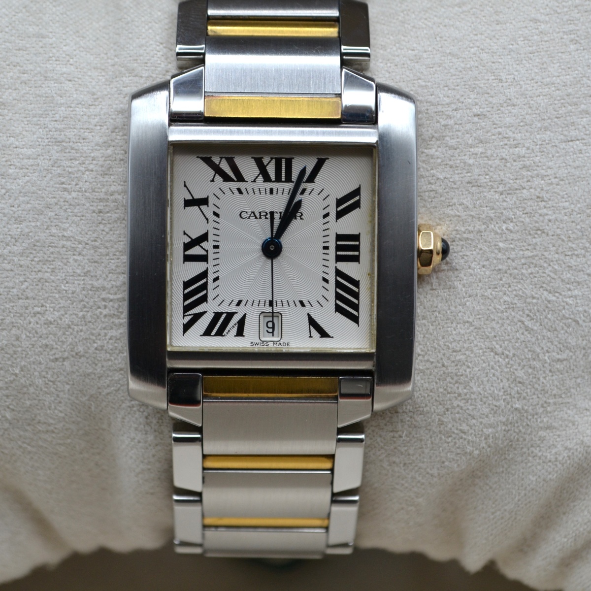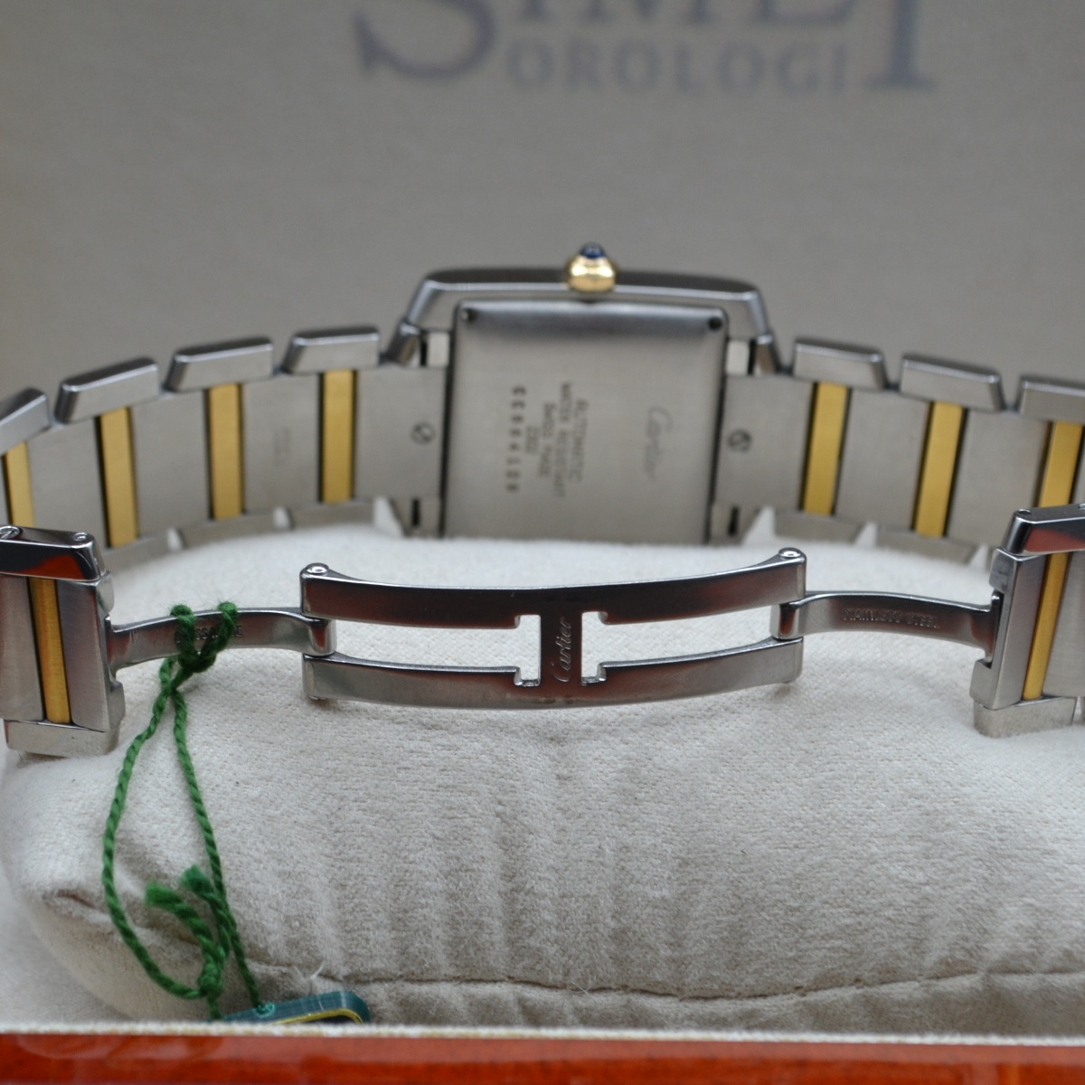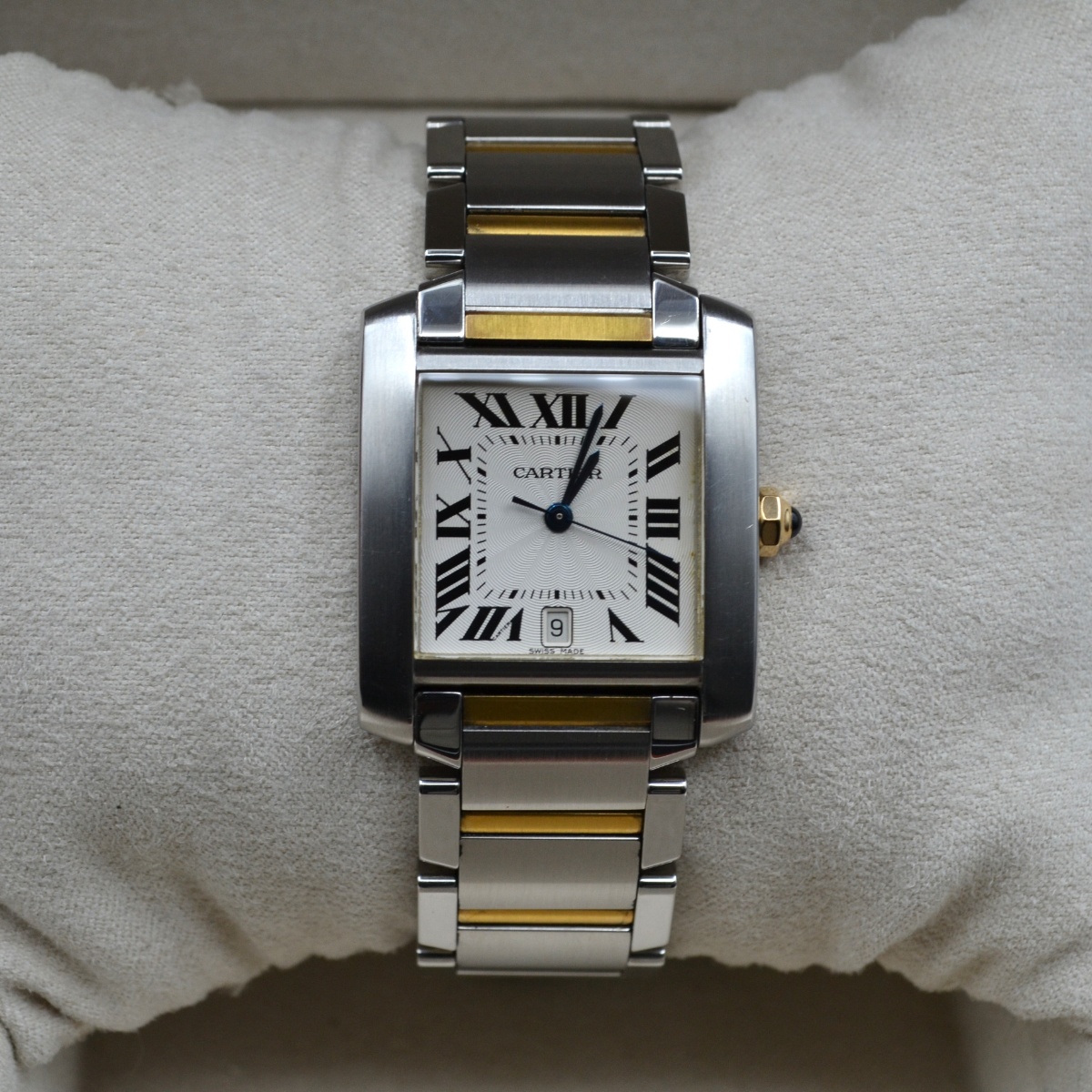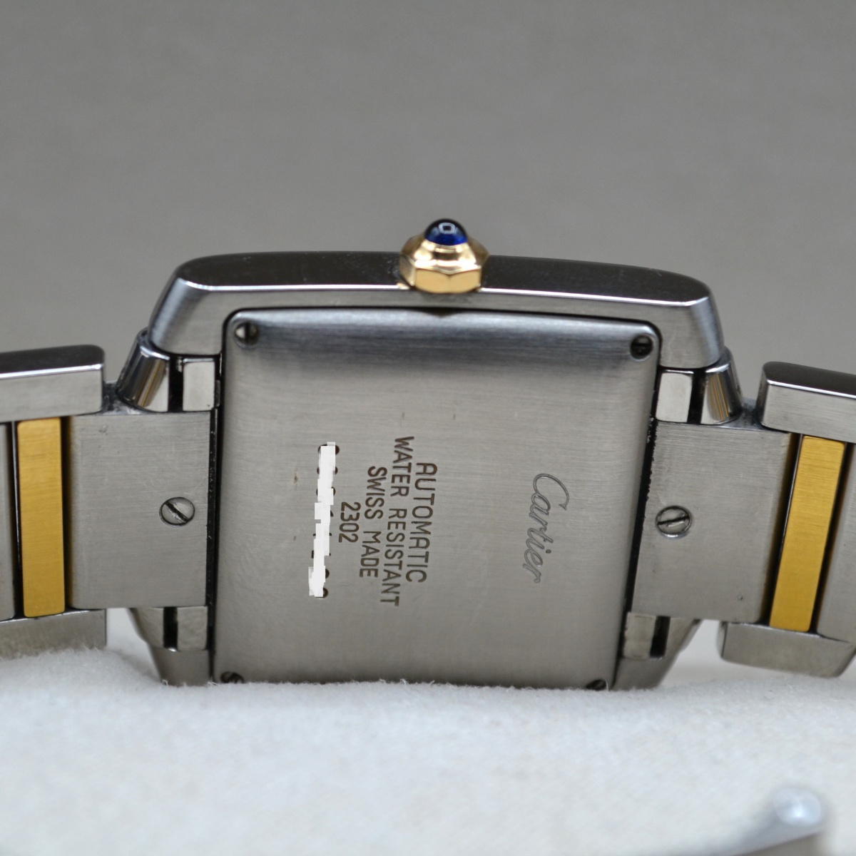 La referenza 2302 è una delle versioni più apprezzate del Tank Française automatico in acciaio e oro, prodotta principalmente tra fine anni ’90 e primi anni 2000. È considerata la versione “media” automatica della linea, molto equilibrata nelle proporzioni.