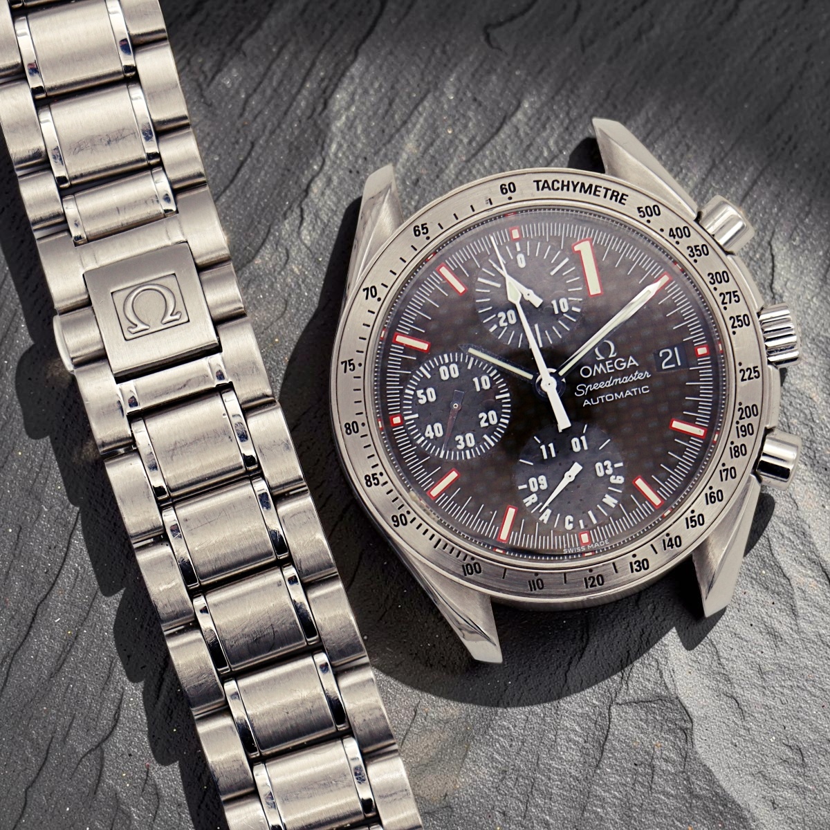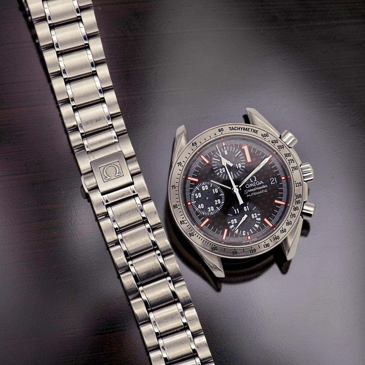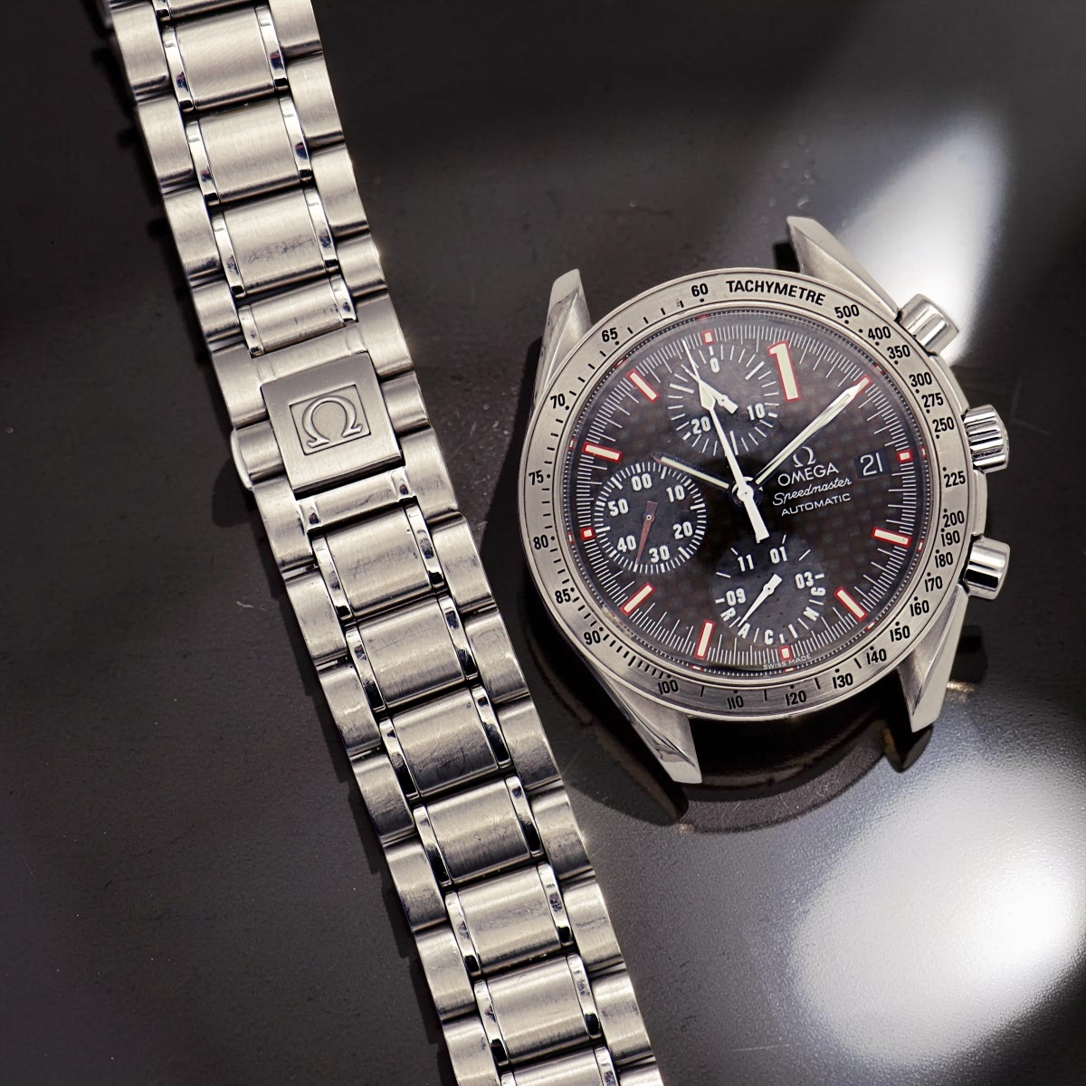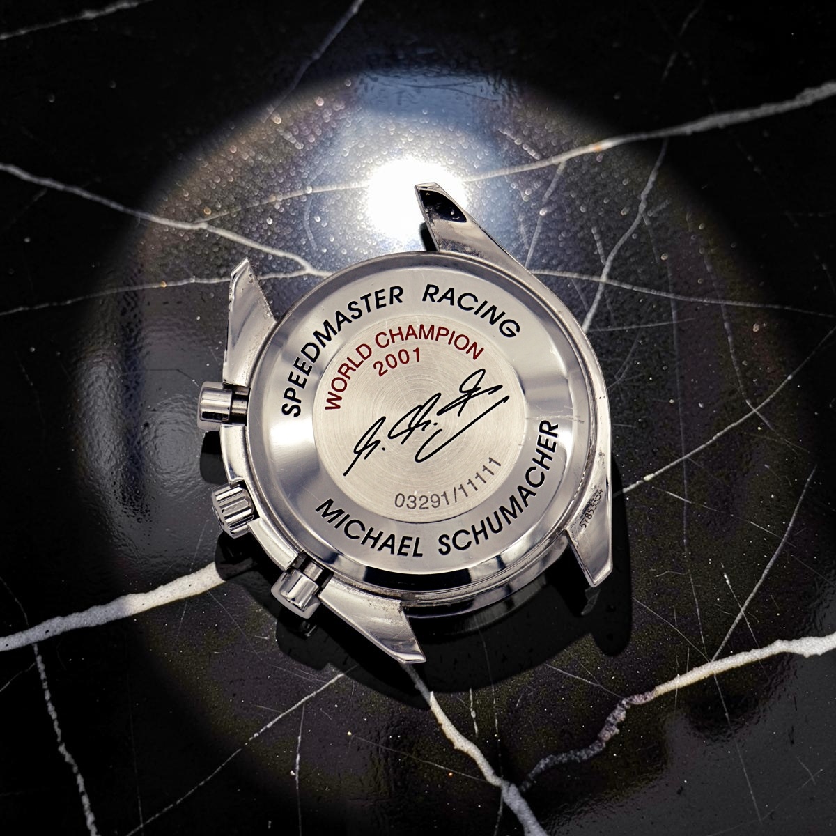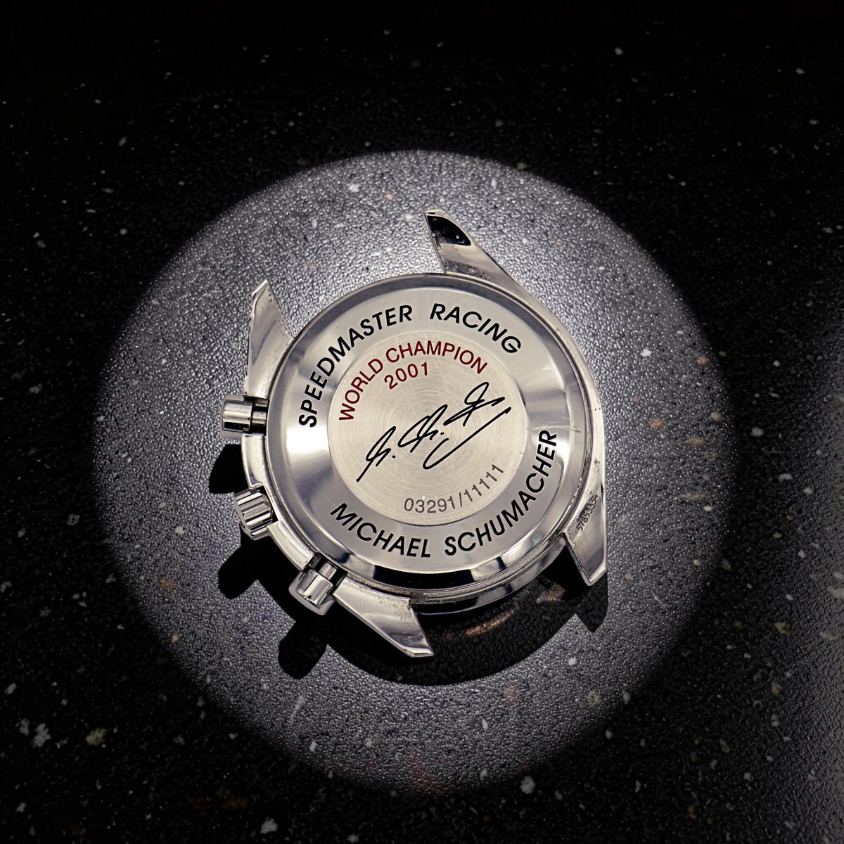 Omega Speedmaster World Champion 2001 Michael Schumacher , was realised in 11.111 pieces. Special black, carbon fiber dial and sub dials. Only watch. |